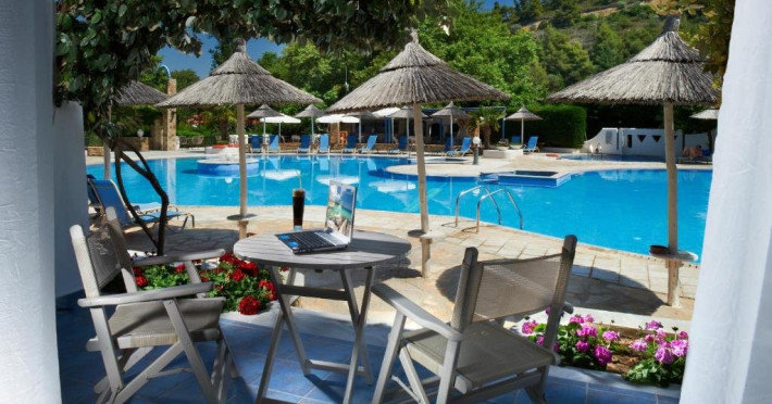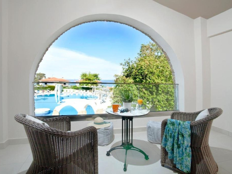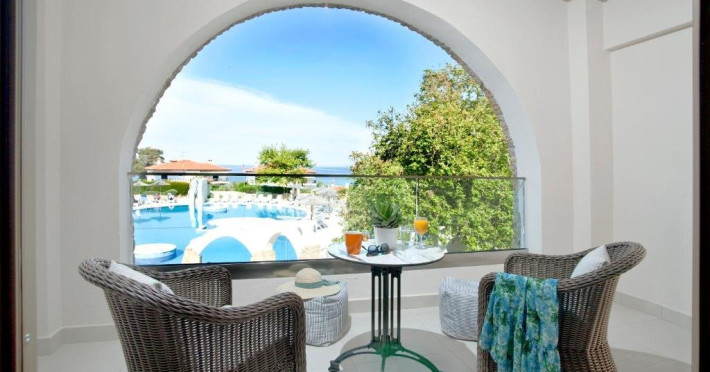 Niciodata pana acum luxul, eleganta si confortul modern nu au coexistat atat de armonios cu peisajul maiestuos din Sithonia. Traieste-ti propria fantezie in Athena Pallas, nava emblematica a Grupului Acrotel. Hotelul include propria plaja privata si este situat pe coasta Elia, pe o raza de 8 km de Neos Marmaras si la 11 km de Nikiti. Oaspetii se pot bucura si de un mic dejun grecesc certificat si pot merge intr-o calatorie gourmet in bucataria greceasca, prin seria Acrotel Dine Divine, formata din cinci restaurante tematice. Dintre care unul, Hierion, a fost premiat la Premiile Turismului 2018 la categoria Gastronomie, pentru conceptul unic de restaurant pe care l-a prezentat. Seamana cu o Trapeza - trapeza manastirilor athoniene. Exista si cinci baruri. Camerele de la Athena Pallas sunt dotate cu TV prin satelit, aer conditionat si minibar, in timp ce casetele au grinzi de lemn si elemente din piatra. Centrul spa al hotelului se extinde pe o suprafata de 1200 m2. Include sali de masaj, sala de manichiura - pedichiura, sauna, bai de aburi si bai cu sare/ulei esentiale din plante. Toate produsele sunt cruelty free si vegane. De asemenea, exista piscine pentru copii, un teren de tenis, cinema, bowling, tenis de masa, biliard si un centru de fitness. Pentru oaspetii mai tineri exista si Mini Kids Club. De asemenea, sunt oferite tururi, activitati si servicii de schimb valutar. Sunt organizate evenimente, cum ar fi nunta, petreceri de burlac, petreceri aniversare, conferinte, intalniri corporative si expozitii. Animalele de companie sunt acceptate cu taxa suplimentara, 30 EUR pe zi, per caine. Facilitati oferite de Athena Pallas Servicii Receptie (receptie 24 de ore) ATM (in apropiere) Casa de schimb valutar Magazine (in interiorul hotelului) Doctor (La telefon) Inchiriere de masini si biciclete (la receptie) Parcare (EV - statie de incarcare) Internet WiFi in camere WiFi in zonele comune Mancare si bauturi Restaurant Mesele servite sub forma de bufet Restaurant a la carte Baruri Copii Loc de joaca pentru copii Animatie pentru copii Mini club Activitati Plaja organizata Umbrele si seturi de plaja (cu taxa) Piscina (piscina incalzita in aer liber) Piscina separata pentru copii Serviciu de prosoape de plaja (cu taxa, Depozit) Animatie in timpul zilei Animatie de seara Sala de gimnastica Teren de tenis (cu taxa) Tenis de masa Darts Biliard Sporturi nautice (cu taxa) Bowling SPA si centru de wellness (cu taxa) Tratamente corporale si faciale (contra cost) Piscina interioara Facilitati de conferinta (maximum 400 de persoane)