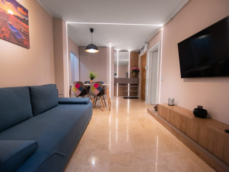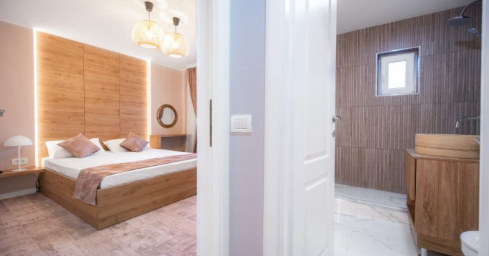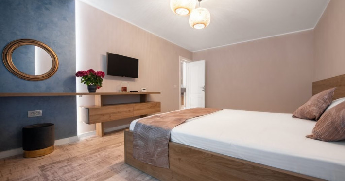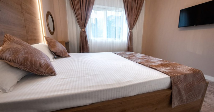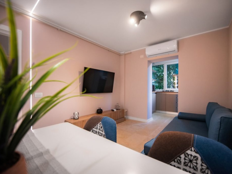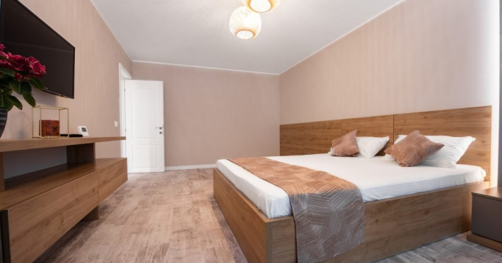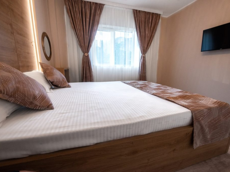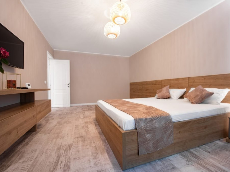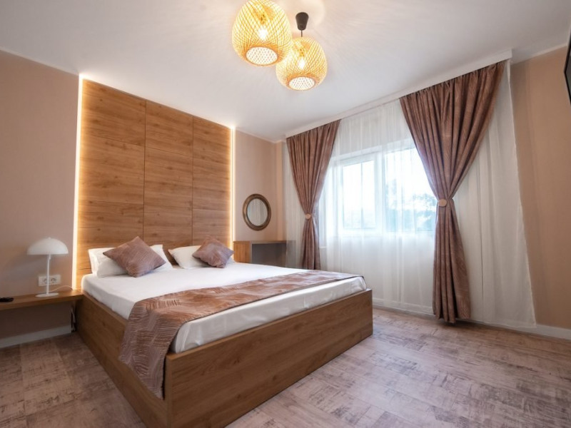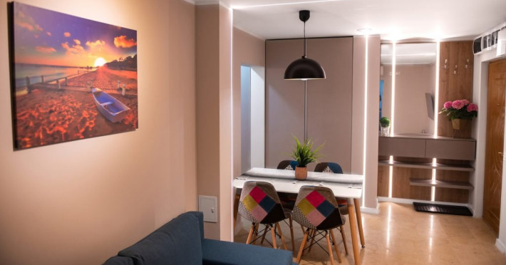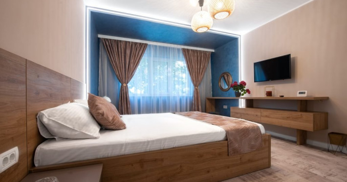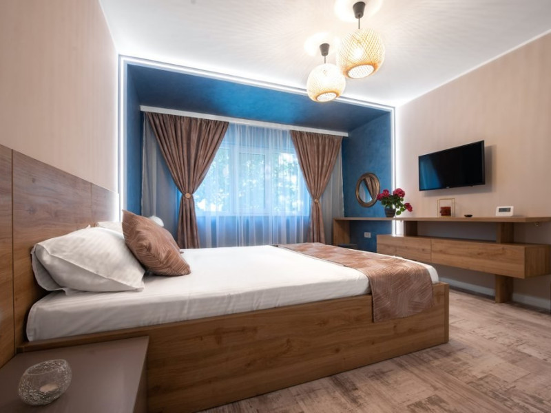 FACILITATI UNITATE Complet renovat, apartamentul are o suprafata de 65 mp si este ideal pentru familii sau grupuri de pana la 5 persoane. Dotari generale: dispune de doua dormitoare cu pat dublu matrimonial de 160/200, un living spatios cu canapea extensibila de 140/200, zona relaxare cu SMART TV LED si zona de luat masa, o bucatarie complet utilata si un balcon cu vedere spre oras. Confort: Aer conditionat, incalzire centrala proprie, TV SMART in fiecare camera cu canale prin satelit, servicii streaming NETFLIX si Wi-Fi gratuit. Bucatarie: Frigider, cuptor cu microunde, fierbator electric, filtru de cafea, vesela si ustensile de bucatarie . Baie: Dus walk-in, uscator de par, articole de toaleta gratuite. Altele: Masina de spalat, fier de calcat, masa de calcat.