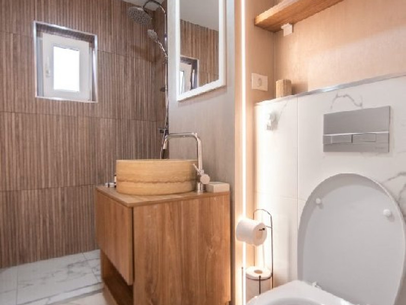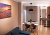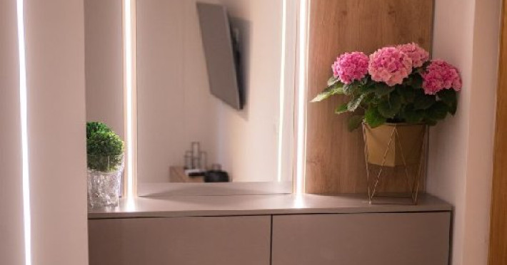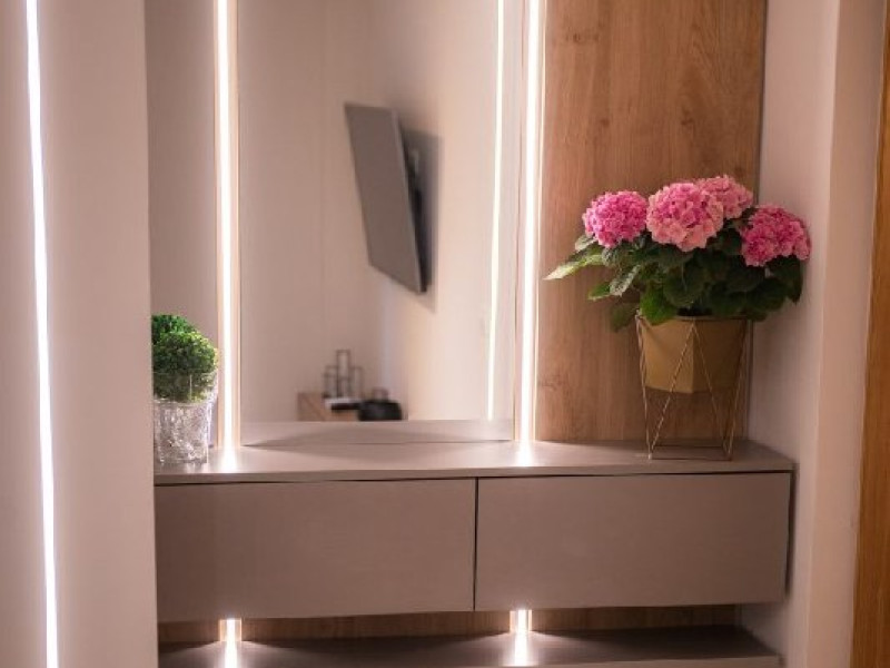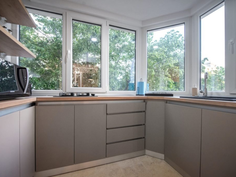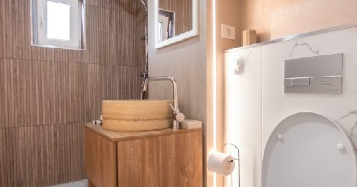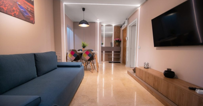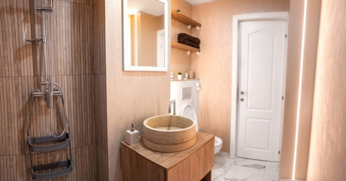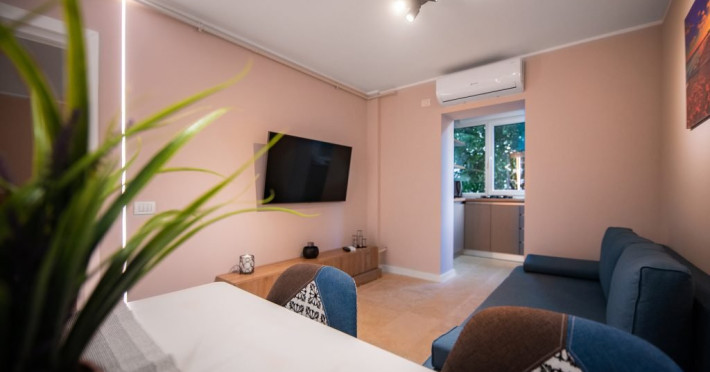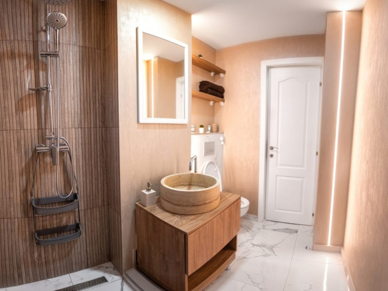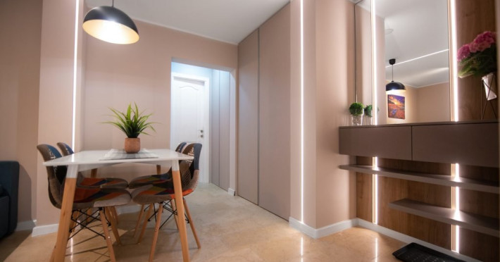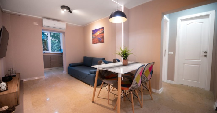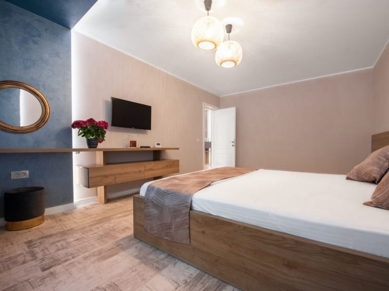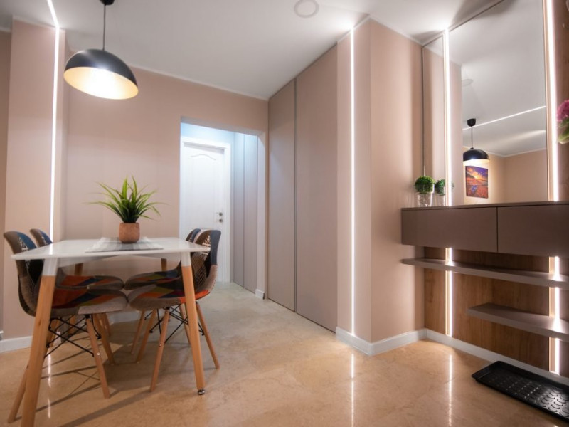 FACILITATI UNITATE Complet renovat, apartamentul are o suprafata de 65 mp si este ideal pentru familii sau grupuri de pana la 5 persoane. Dotari generale: dispune de doua dormitoare cu pat dublu matrimonial de 160/200, un living spatios cu canapea extensibila de 140/200, zona relaxare cu SMART TV LED si zona de luat masa, o bucatarie complet utilata si un balcon cu vedere spre oras. Confort: Aer conditionat, incalzire centrala proprie, TV SMART in fiecare camera cu canale prin satelit, servicii streaming NETFLIX si Wi-Fi gratuit. Bucatarie: Frigider, cuptor cu microunde, fierbator electric, filtru de cafea, vesela si ustensile de bucatarie . Baie: Dus walk-in, uscator de par, articole de toaleta gratuite. Altele: Masina de spalat, fier de calcat, masa de calcat.