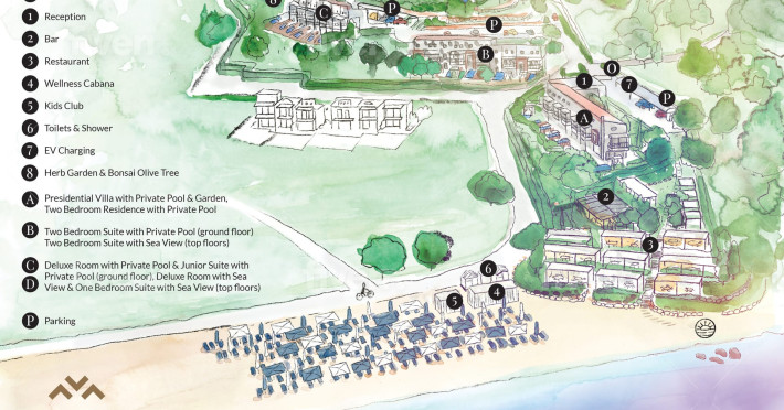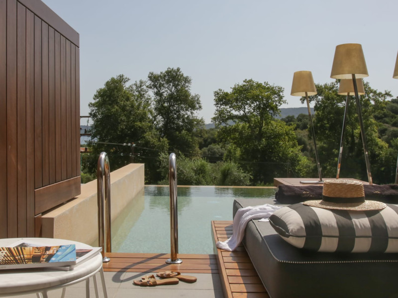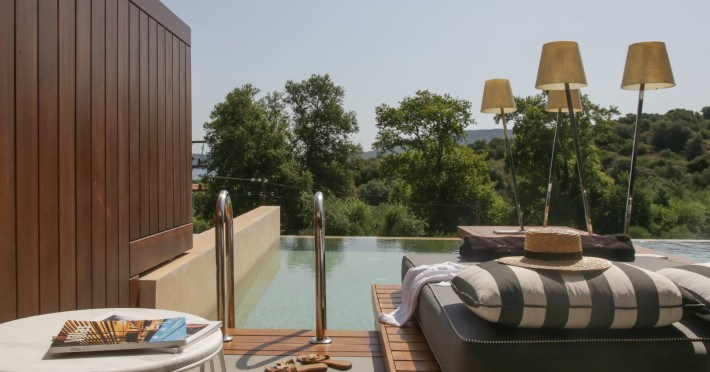 It consists of an exclusive collection of 56 luxury rooms,suites and villas. Most of them have private pools with in-built sunbeds which tantalize the feeling of relaxation in our Mediterranean gardens.
