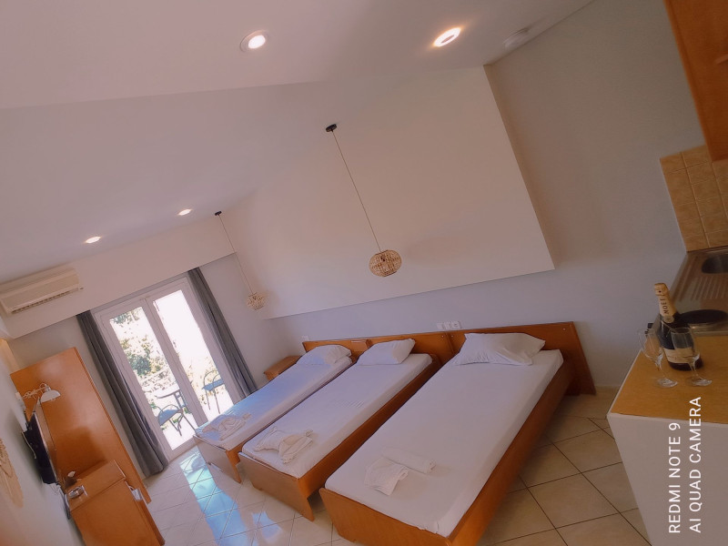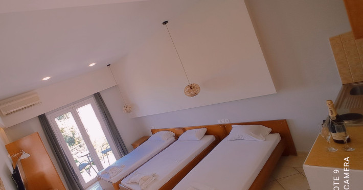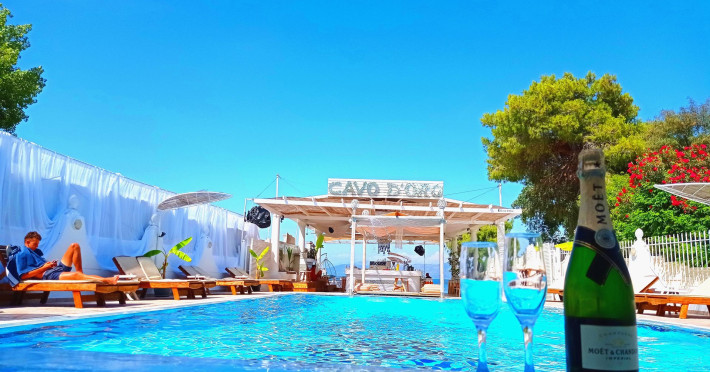 The Cavo D'oro is a quiet family complex is located right on the long sandy beach af kavos, offering genuine Greek hospitality for backpackers as well as for couples, families and small groups. Our property disposes of outdoor swimming pool, beach bar with sunbeds and umbrellas.The property offers beach area with sunbeds and umbrellas , where guests can chill by day. All rooms feature air- conditioning , private bathroom, kitchenette and a furnished sunny balcony. Breakfast , snaks, meals served by the pool and beach. Free WI-FI acess is possible in public areas.