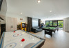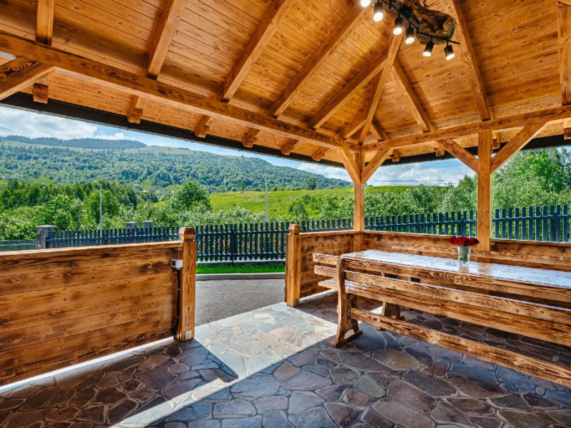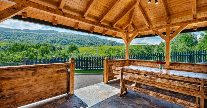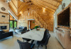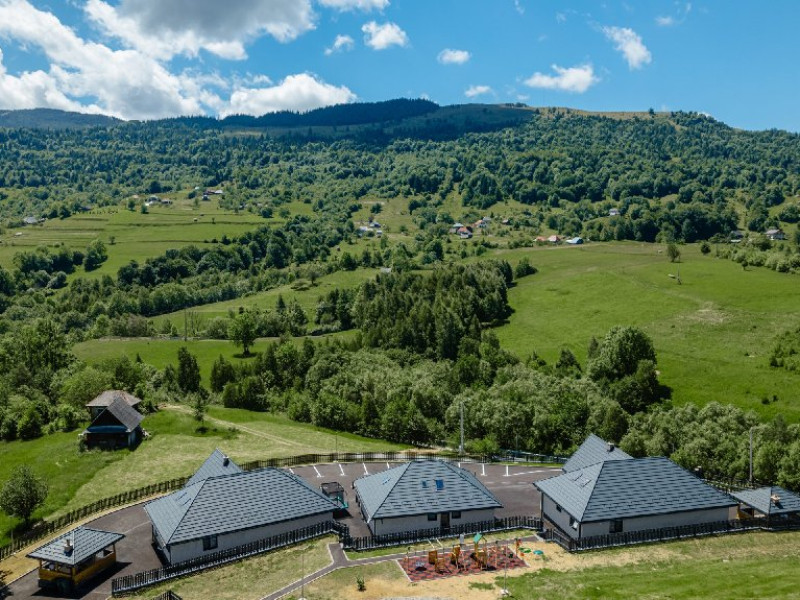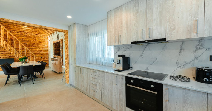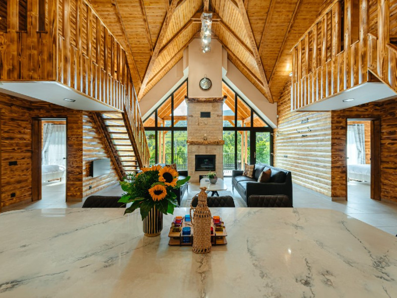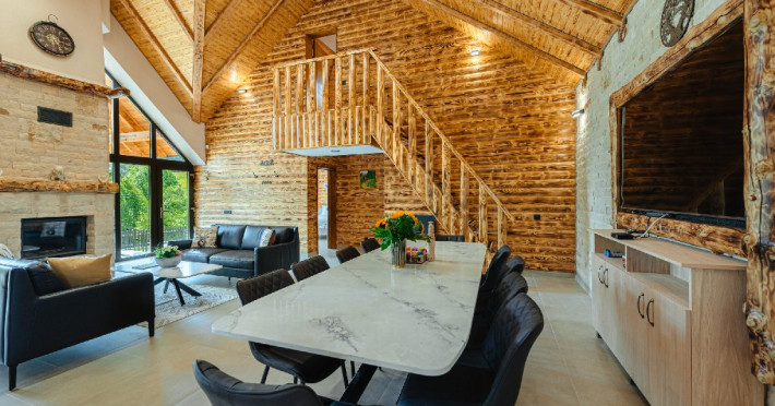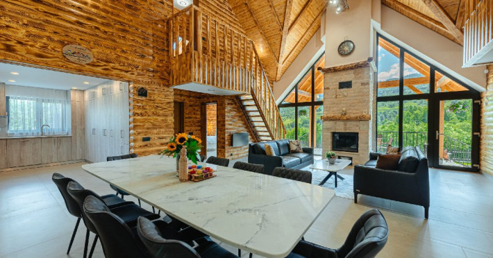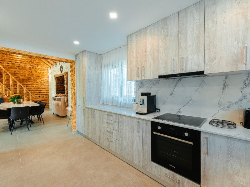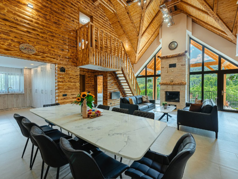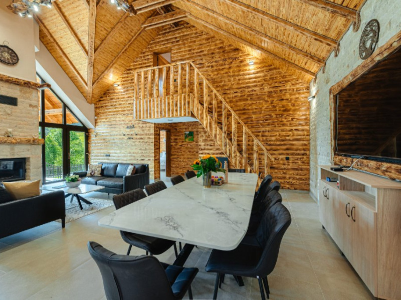 FACILITATI UNITATE DE CAZARE: Fiecare casa dispune de un living spatios, mobilat cu canapele din piele naturala, o masuta de cafea si o masa mare din cuart pentru 10 persoane, precum si un semineu pe lemne pentru serile racoroase. In fiecare camera sunt radiatoare electrice controlate digital pentru confortul individual al clientilor. Bucataria este complet echipata cu o masina de cafea cu boabe, cuptor cu microunde, fierbator de apa, cuptor si aragaz electric, combina frigorifica si o masina de spalat haine cu uscator. Fiecare casa are o terasa proprie cu masa si scaune, un sistem audio cu conexiune Bluetooth si un foisor cu loc de gratar/ceaun si o masa mare si banci. La cerere, avem disponibile si 2 patuturi pentru copiii mici in fiecare casa.