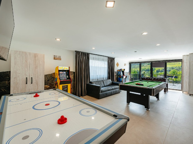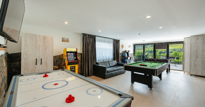 La dispozitia clientilor nostri avem un centru spa cu jacuzzi pentru 9 persoane si o sauna moderna, precum si o sala de jocuri echipata cu masa de biliard, air hockey, fotbal de masa si jocuri electronice de tip PacMaN. In spatele resortului, am amenajat un loc de joaca cu leagane, tobogan, perete de catarat, un loc de joaca cu nisip si o tiroliana pentru copii. De asemenea, avem trambulina, karturi si biciclete pentru copii. La cerere, se pot juca badminton si volei. Avem si un loc special amenajat pentru foc de tabara.