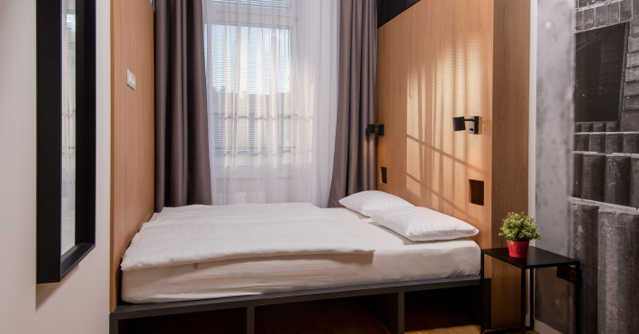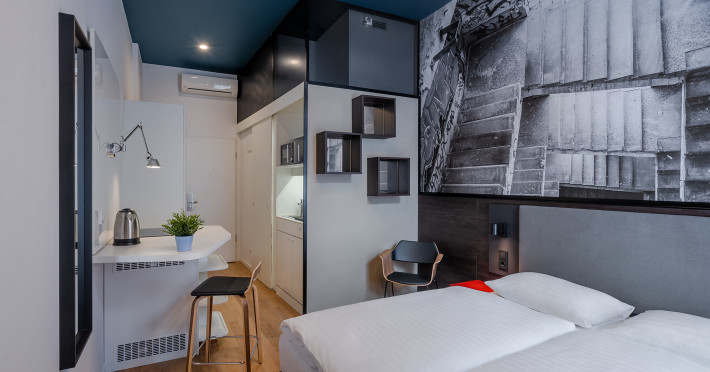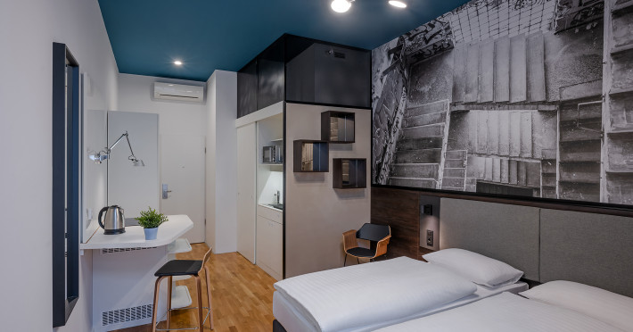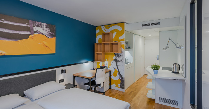 [A] Double room Superior : min. 20 m2 room category: superior room type: double room number of rooms: bedroom 1x, kitchen 1x, bath room 1x number of beds: double bed 1x general: air-conditioning - free of charge, safe - free of charge, heating, kettle, toilet paper - free of charge, bed linen - free of charge, towels - free of charge, kitchen linen - free of charge bath room: toilet, shower living area: writing desk kitchen: kitchenette, dish washer, fridge, microwave, kettle, basic equipped kitchen media technology: wifi - free of charge room view: city view, courtyard view