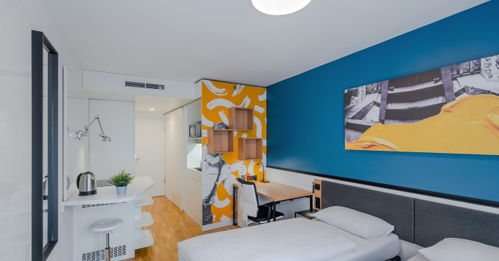 [B] double room superior Twin : min. 20 m2 room category: superior room type: double room number of rooms: bedroom 1x, bath room 1x number of beds: twin bed 2x general: air-conditioning - free of charge, safe - free of charge, heating, kettle, toilet paper - free of charge, bed linen - free of charge, towels - free of charge, kitchen linen - free of charge bath room: toilet, shower living area: writing desk kitchen: kitchenette, dish washer, fridge, microwave, kettle, basic equipped kitchen media technology: wifi - free of charge room view: city view, courtyard view