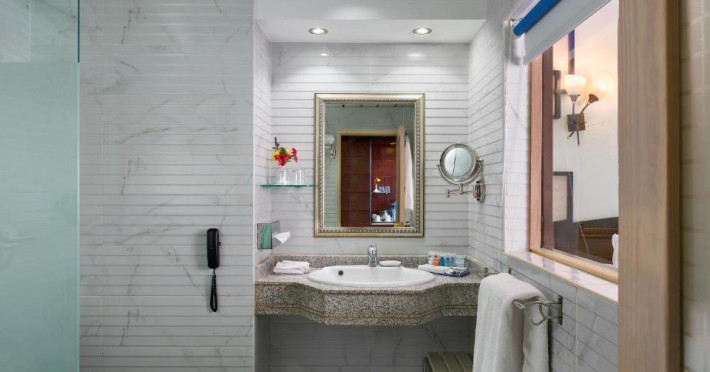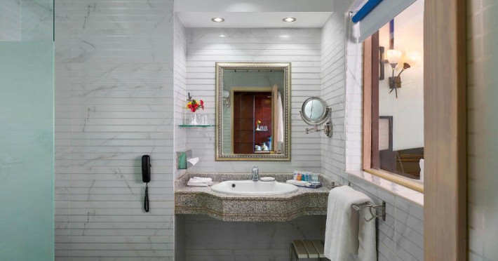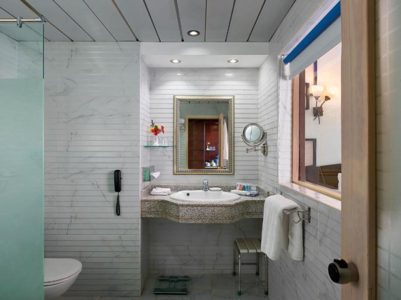 Un aparat de aer condiționat și un sistem de incălzire creează o atmosferă plăcută in camere. In majoritatea spațiilor de cazare clienții au vedere laterală spre mare de pe balcon sau terasă. Printre avantajele unora dintre spațiile de cazare se numără o frumoasă priveliște spre mare. Există un minibar. Echiparea de bază cuprinde de asemenea și un aparat pentru cafea/ceai. Se garantează diverse posibilități de comunicare și divertisment prin echiparea cu un telefon cu apelare directă și canale prin satelit. In baia dotată cu o cadă stă la dispoziție un uscător de păr. Se oferă spre rezervare camere adaptate pentru scaun cu rotile. Pentru familiile cu copii stau la dispoziție camere de familie.