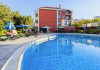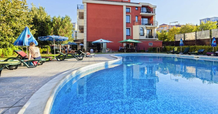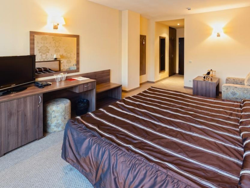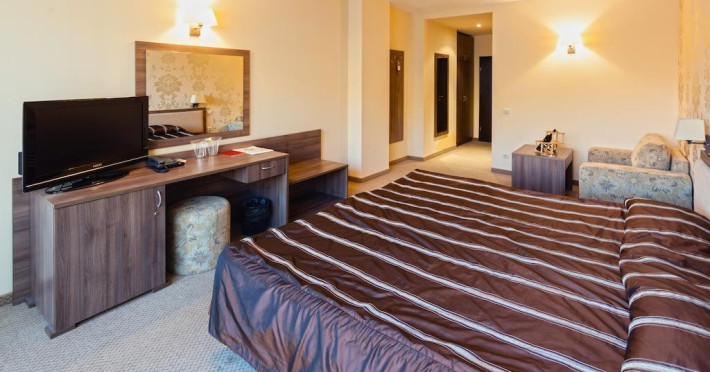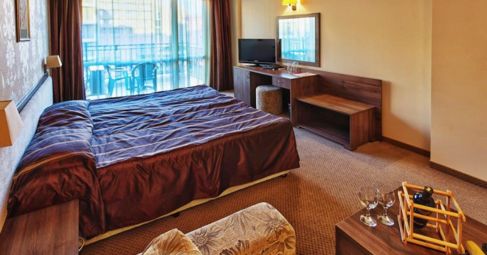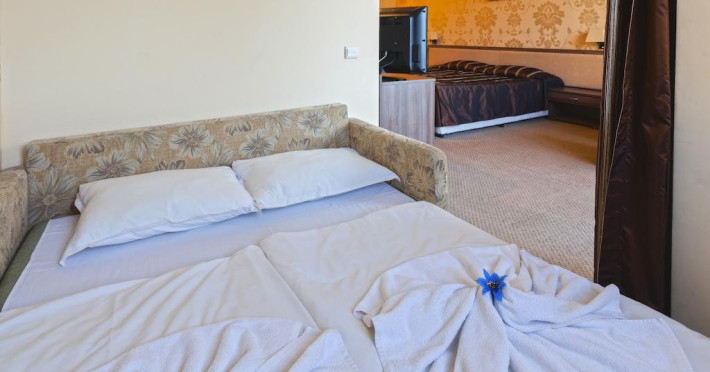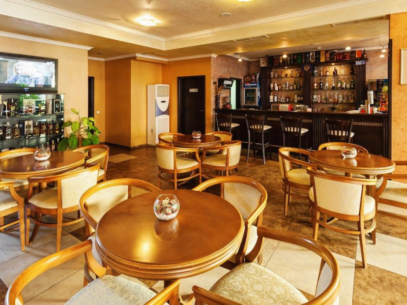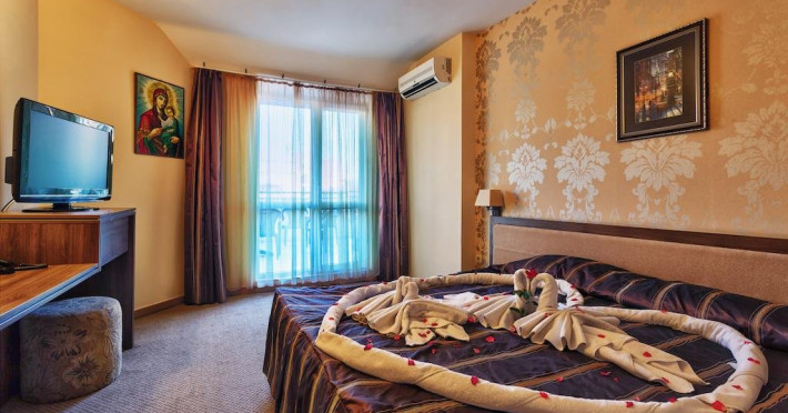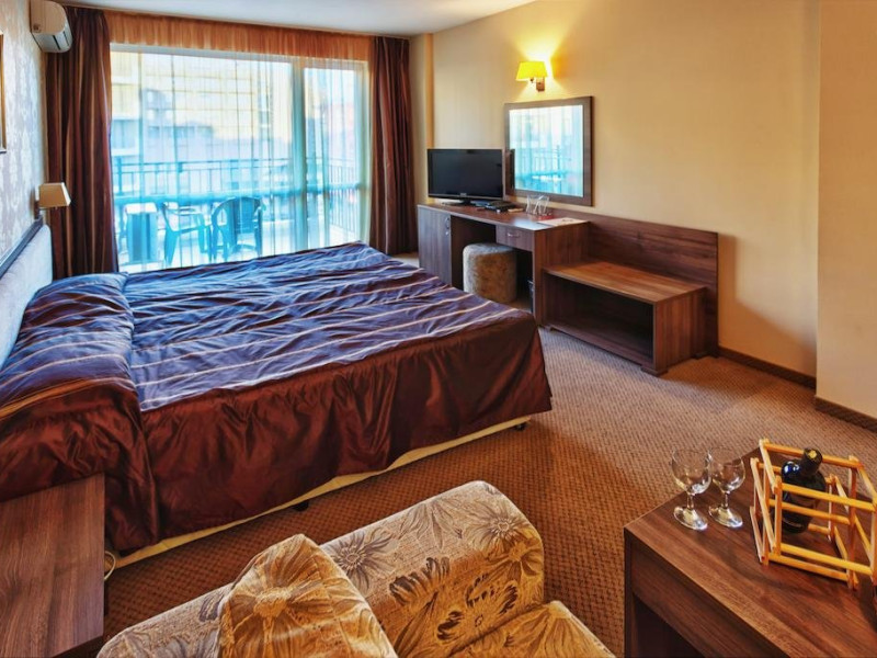 Alimente si bauturi: - Mic dejun tip bufet: 07:30-10:00 h. - la restaurantul principal produse de patiserie, produse de patiserie, fructe, paine, dulceturi si tartine cu bauturi precum ceai, cafea, lapte cald si rece, apa si suc. - Pranz tip bufet: 12:00-14:00. - la restaurantul principal o varietate de preparate calde si reci, produse lactate, fructe de sezon, o varietate bogata de preparate din bucataria bulgara si internationala cu apa, bauturi racoritoare si bauturi calde, bere, vin rosu si alb. - Cina tip bufet: 18:00-20:30. - la restaurantul principal o varietate de preparate calde si reci, produse lactate, fructe de sezon, o varietate bogata de preparate din bucataria bulgara si internationala cu ceai, cafea, lapte, apa si bauturi racoritoare, bere, vin rosu si alb. *Exista 2 cine tematice pe saptamana - Pool Bar : 11:00-15:00 h. - pizza, hotdog, burger, sandviciuri, bruschetta 15:00-17:00 h. - clatite, gogosi, deserturi, dulciuri si inghetata 10:00-23:00 h. - cafea, ceai, lapte 11:00-23:00. - bauturi alcoolice si nealcoolice locale - Bar all inclusive 11:00-23:00. - ceai, cafea, lapte, bauturi alcoolice si nealcoolice locale si de import