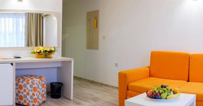 Alimente si bauturi: - Mic dejun: 7:30 - 10:00. Bufet deschis in restaurantul principal. Bucatarie internationala cu o gama larga de optiuni din care sa alegeti. Bauturile disponibile la micul dejun includ apa, bauturi racoritoare si bauturi calde. - Pranz: 12:30 - 14:30. Bufet deschis in restaurantul principal. Bucatarie internationala, optiuni de mancare vegetariana si sanatoasa, colt alimentar cu salate proaspete, si preparate din carne, produse de patiserie, fructe, apa, bauturi racoritoare, bauturi calde, bere la halba, vin, bauturi alcoolice /marci locale/. - Gustari: 11:00 - 17:30 Bufet deschis la Snack bar. Sandvisuri, pizza, burgeri, hot dog, cartofi prajiti, fructe, dulciuri, prajituri - Inghetata: 12:30 - 14:30 si 18:30 - 21:00 disponibila la pranz si cina in restaurantul principal - Cina: 18:30 - 21:00. Bufet deschis in restaurantul principal. Bucatarie internationala, optiuni de mancare vegetariana si sanatoasa, colt dietetic cu salate proaspete, preparate din carne, produse de patiserie, fructe, apa, bauturi racoritoare, bauturi calde, bere la halba, vin, bauturi alcoolice /marci locale/. Bauturi: - 11:00 - 22:30 la Snack Bar - bauturi alcoolice si nealcoolice locale (vin, bere, bauturi spirtoase locale, cocktailuri, bauturi racoritoare, apa minerala, ceai si cafea). - 09:00 - 23:30 la Lobby bar - Bauturi alcoolice si nealcoolice locale (vin, bere, bauturi spirtoase locale, cocktailuri, bauturi racoritoare, apa minerala, ceai si cafea). NOTA: Nu pot fi aduse alimente sau bauturi in camere fara acordul scris al conducerii hotelului. Conducerea hotelului are dreptul de a face modificari sub rezerva unei notificari in timp util cu privire la serviciile de mai sus si la programul acestora. *In all inclusive sunt incluse cateva terci si piureuri pentru bebelusi.