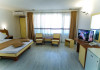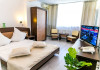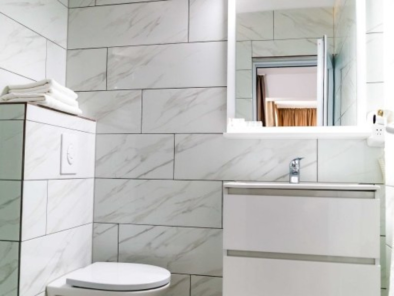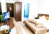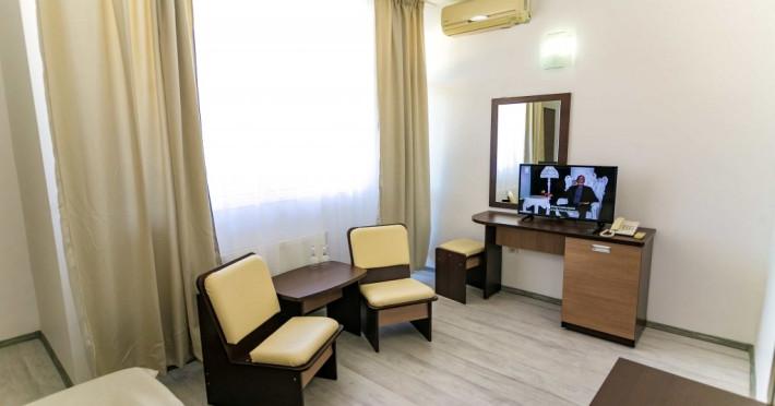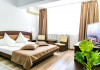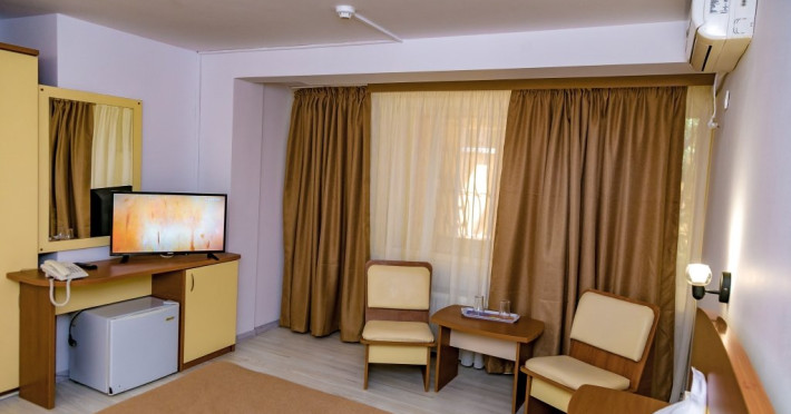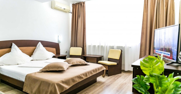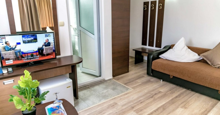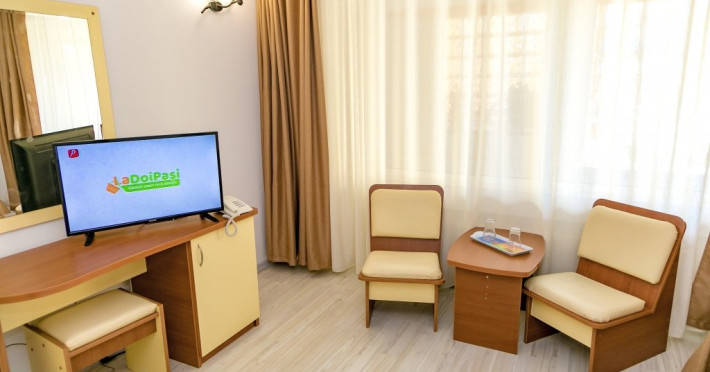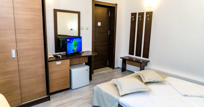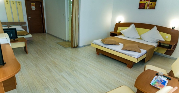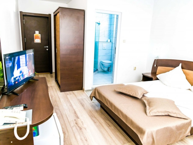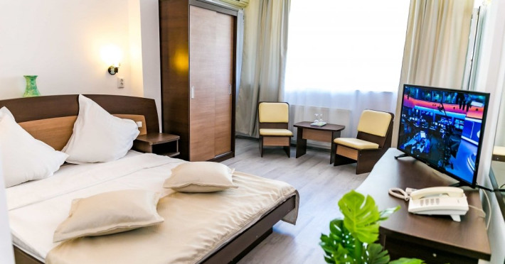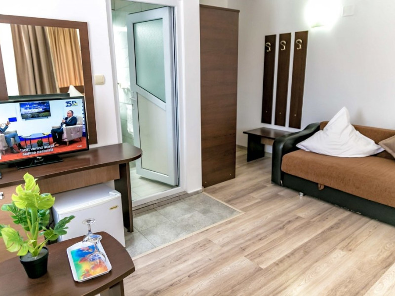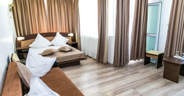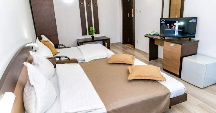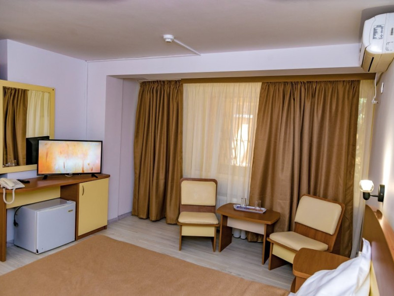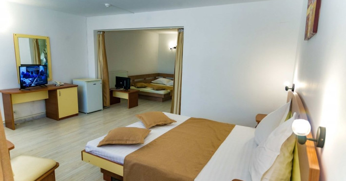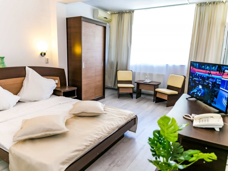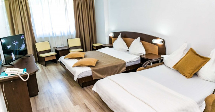 DESCRIERE CAMERE Hotelul se compune din: - 17 camere duble cu pat matrimonial de 160/200 cm. - 1 garsoniera cu doua paturi matrimoniale: un pat de 140/200 cm si un pat de 160/200 cm) - 4 triple cu pat matrimonial de 160/200 cm si canapea extensibila cu latime de 120 cm sau 140cm) - 2 suite cu pat matrimonial de 160/200 cm si canapea extensibila cu latime de 140cm. Fiecare camera dispune de baie, aparat de aer conditionat si TV. Dotari camere: parchet, aer conditionat, minibar (frigider), telefon, uscator de par, TV, internet wireless - gratuit, baie proprie cu cabina de dus, balcoane (la un anumit nr. de camere) cu masuta si scaune de relaxare.