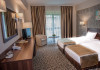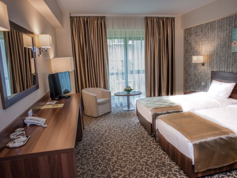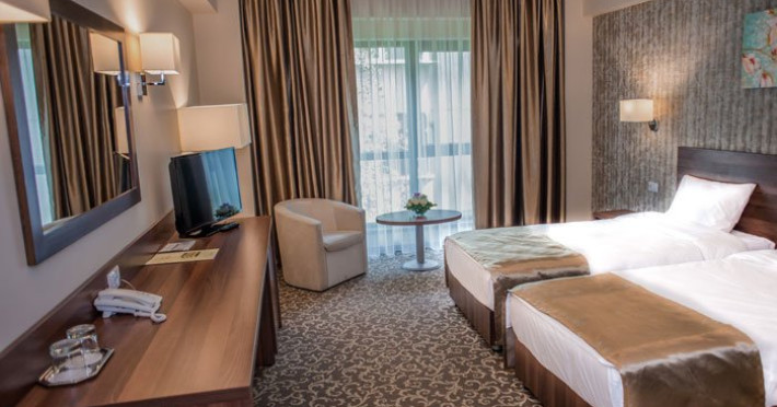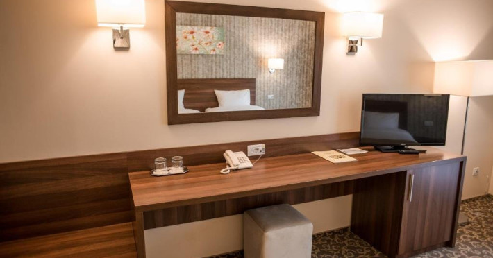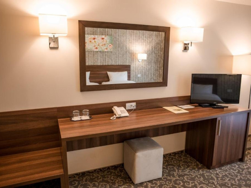 DESCRIERE CAMERE Hotelul dispune de camere spatioase (20 mp) si luminoase, cu paturi separate de 100 cm latime dotate cu aer conditionat, internet Wi-Fi si wired gratuit, televizor cu ecran plat, minibar, uscator de par.