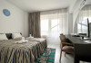 Dubla Superior: dispune de un pat matrimonial si de o canapea extensibila (de 2 locuri ). Camera de aproximativ 26 mp, aer conditionat, TV, frigider, wifi, baie proprie, balcon, masa si scaune pentru balcon. Camerele au vedere la piscina si la mare.