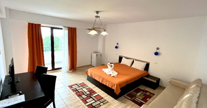 Apartamentul Standard: 1 dormitor cu pat matrimonial, living cu canapea extensibila (de 2 locuri). Camera de aproximativ 50 mp, aer conditionat, TV, frigider, wifi, baie proprie, terasa cu vedere la mare, cu scaune si masa.