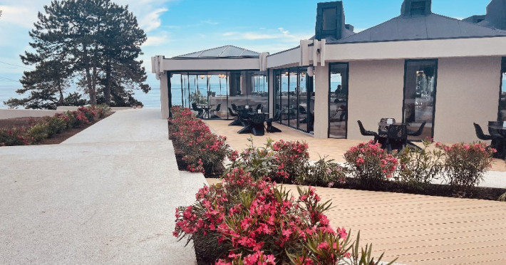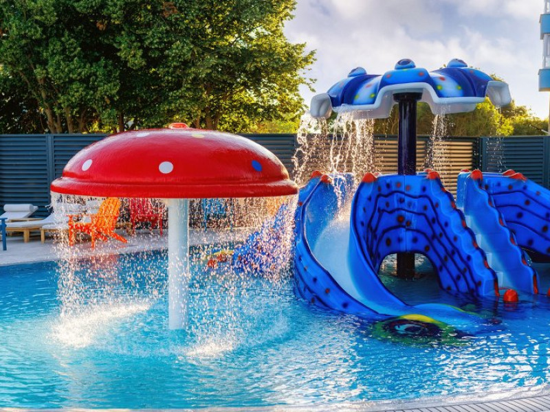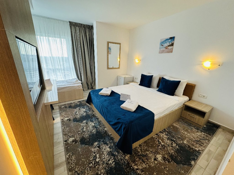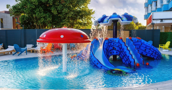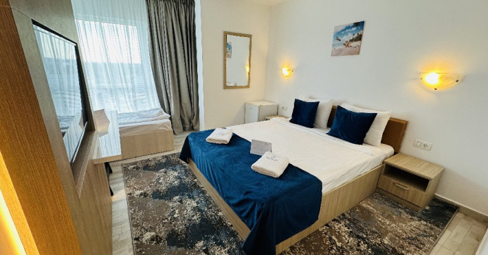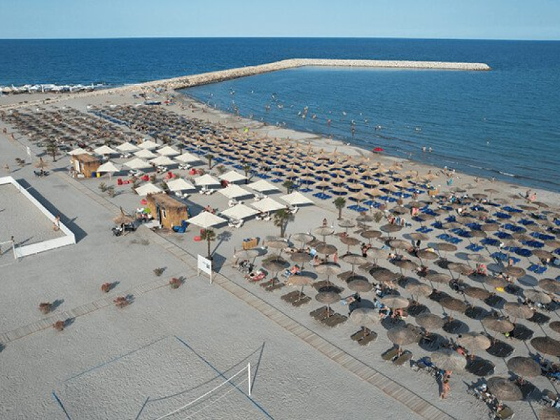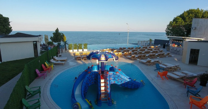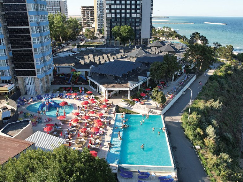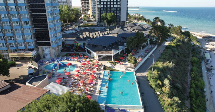 FACILITATI UNITATE Hotelul beneficiaza de plaja privata situata in fata resort-ului, locuri de joaca interioare si exterioare pentru copii, piscine pentru adulti si pentru copii, Beach Bar. Hotelul dispune de un restaurant cu terasa, Pool Bar, o sala de conferinte complet echipata, locuri de joaca interioare si exterioare, o piscina pentru cei mici, cu tobogane si cascada cu apa si o fermecatoare piscina tip Infinity, cu apa sarata direct din Marea Neagra, dedicata adultilor, plaja privata situata fix in fata hotelului, amenajata si largita incepand cu anul 2025 sa deserveasca clientii hotelului;