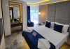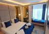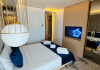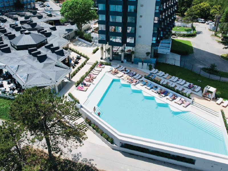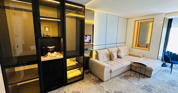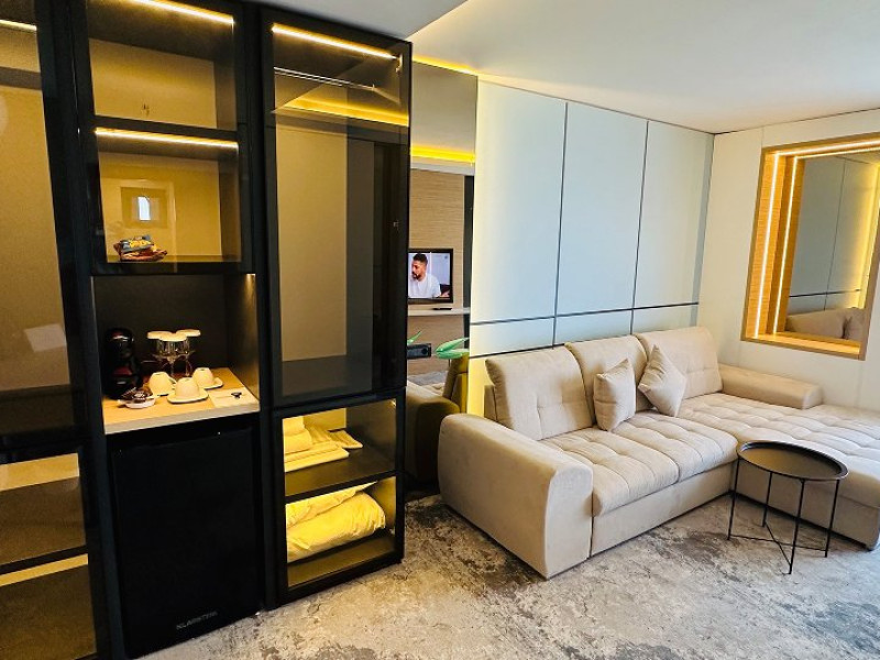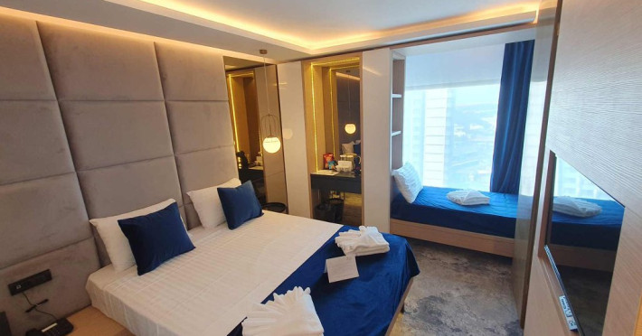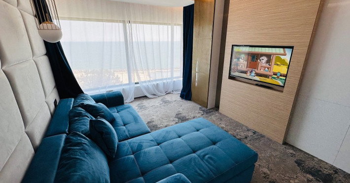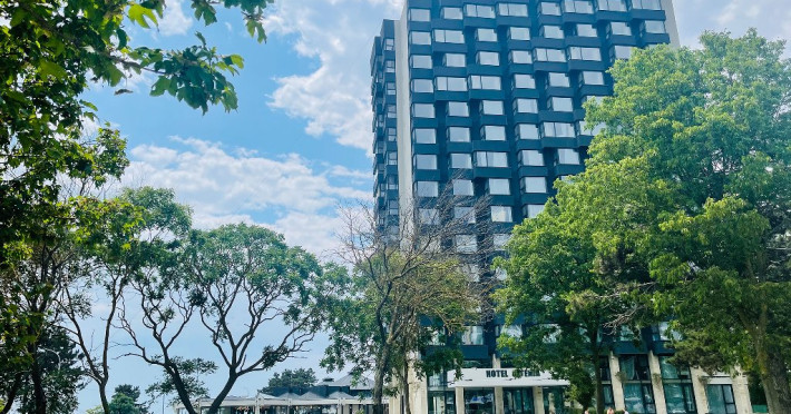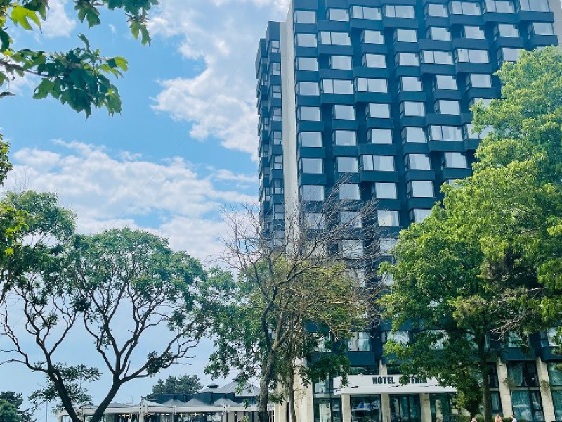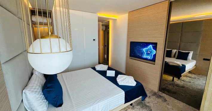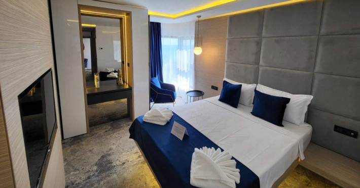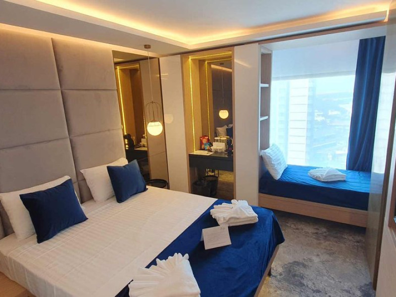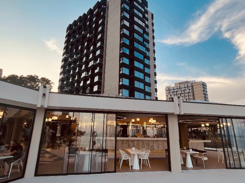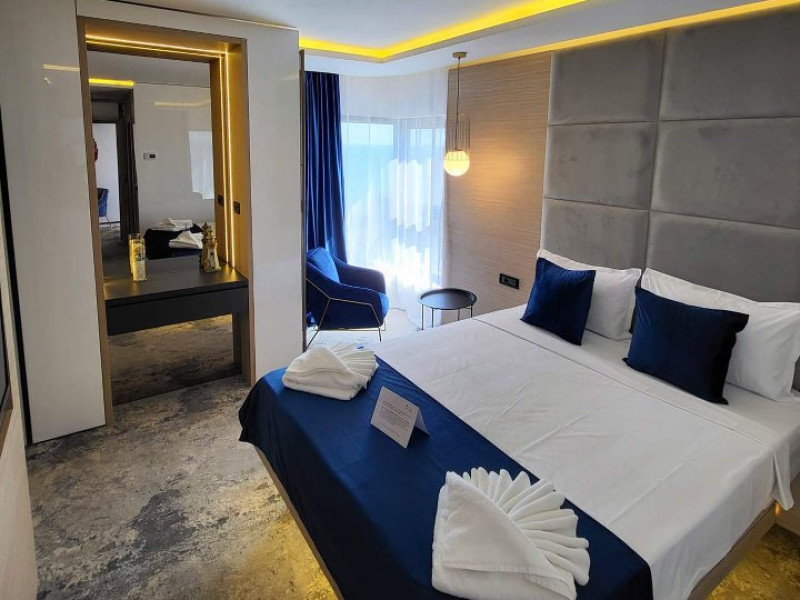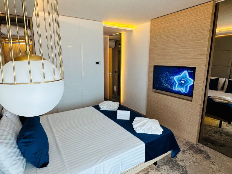 DESCRIERE CAMERE Hotelul detine peste 200 de unitati de cazare repartizate in camere duble, triple, suite si apartamente alaturi de restaurant, cu o capacitate de peste 450 de persoane. Toate camerele sunt complet renovate si dotate cu: baie cu dus, televizor LCD, minibar, birou, sistem de climatizare uscator de par, fotoliu, internet wi-fi. Au vedere laterala la mare si statiune. Nu au balcon. Camerele duble au 16 mp. DUBLA SUPERIOR PARTIAL SEA VIEW - modernizata complet in anul 2023 beneficiaza de un pat dublu de 160 x 200 cm, ridicat pentru a permite optimizarea bagajelor dedesubt, TV, minibar, aparat pentru cafea espresso, baie cu dus, uscator de par, fier de calcat, seif si internet. Aceste camere sunt situate la etajele 5-12 ofera vedere partiala la mare si dispun de o masuta pentru cafea si un fotoliu fix. SMALL TRIPLE ROOM -Camerele triple au fost reconfigurate pentru a optimiza suprafata de 15,3 mp si beneficiaza de un design modern, dispun de un pat dublu de 140 x 200cm, un pat de o persoana de 80 x 200 cm, ridicat pentru a permite optimizarea bagajelor dedesubt, TV, minibar, aparat pentru cafea, cabina de dus, uscator de par, fier de calcat, seif si internet. Aceste camere, situate la etajele 4-13 ofera vedere partiala la mare si dispun de o masuta pentru cafea si un fotoliu fix. APARTAMENT - inaugurate in 2023, apartamentele sunt situate pe partea de nord a hotelului si au vedere partiala la mare. Apartamentele au o suprafata de 35 mp si sunt compuse din 2 camere, living, dormitor si baie. Dormitorul este utilat cu pat dublu de 160 x 200 cm, TV. Livingul este dotat cu o canapea extensibila de 180 x 70 cm (180 x140cm extins), birou, minibar, 2 dulapuri duble, filtru de cafea, aer conditionat, TV. Apartamentele sunt situate la nivelurile 1-10. SUITE - Suitele cuprind 2 camere - living si dormitor, un hol, doua bai dotate cu o cabina de dus, uscator de par. Dormitorul contine un pat dublu de 160 x 200 cm. Living-ul generos dispune de o canapea extensibila, minibar modern, expressor cafea. Suprafata totala a suitei este de 35 mp si este conceputa pentru maximum 4 adulti.