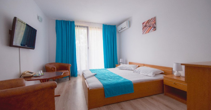 DESCRIERE CAMERE Dotari camere: aer conditionat, TV -LCD, minibar, baie cu dus, balcon, internet -wireless. Camerele Duble Standard dispun de mobilier reconditionat, iar Camerele Duble Superior dispun de mobilier nou !