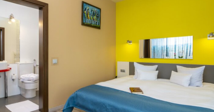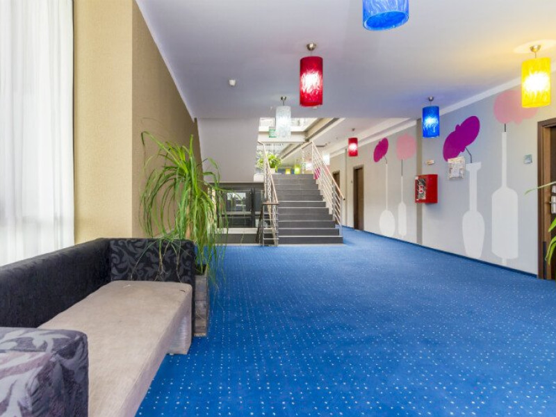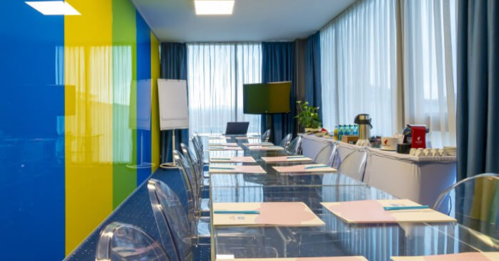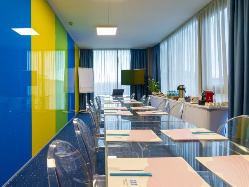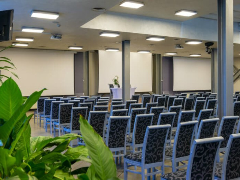 FACILITATI CONFERINTE Hotelul pune la dispozitie 4 sali de conferinta cu lumina naturala, aer conditionat, sonorizare si acces internet Wi-Fi, complet echipate tehnic cu tot ceea e nevoie pentru un eveniment de succes. Sala Crystal (parter) este sala de conferinte perfecta pentru intalnirile de amploare, avand o capacitate de 300 de locuri. Este o sala multifunctionala ce poate gazdui conferinte mari de business, seminarii, training-uri, prezentari de produse sau alte evenimente cu audienta mare. Sala de conferinte Blue Sky (etaj 1) are o capacitate de 80 de locuri, fiind ideala pentru prezentari, training-uri, seminarii, conferinte, workshop-uri sau alte evenimente de dimensiuni medii. Sala de conferinte Board Room (etaj 1) are o capacitate de 14 locuri, fiind ideala pentru sedinte, intalniri de afaceri, conferinte, prezentari si training-uri care necesita un cadru restrans de desfasurare. Sala de conferinte Color Room are o capacitate de 20 locuri, fiind ideala pentru evenimente intime, sedinte de coaching, training-uri si intalniri in cadru restrans.