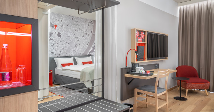 [A] Double room Superior : min. 21 m2 room category: superior room type: double room number of rooms: bedroom 1x, bath room 1x number of beds: double bed 1x, cot as overcrowding possible: Yes general: air-conditioning - free of charge, safe - free of charge, heating - free of charge, kettle, toilet paper - free of charge, bed linen - free of charge, towels - free of charge bath room: toilet, hair dryer, shower living area: writing desk, seating area kitchen: fridge media technology: telephone, TV, wifi - free of charge room view: city view limited