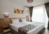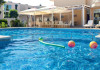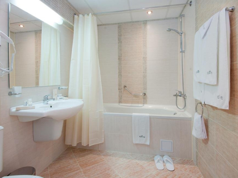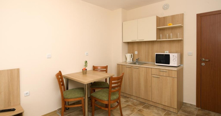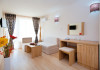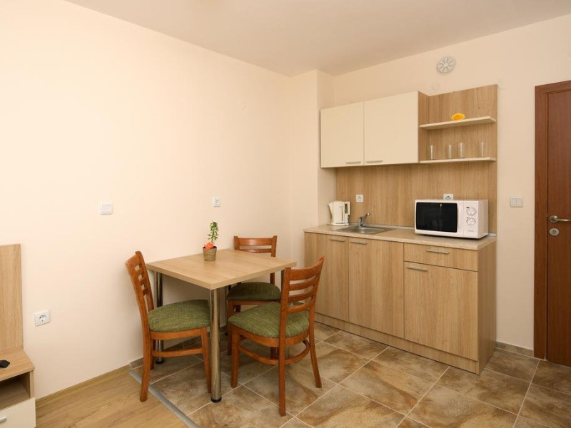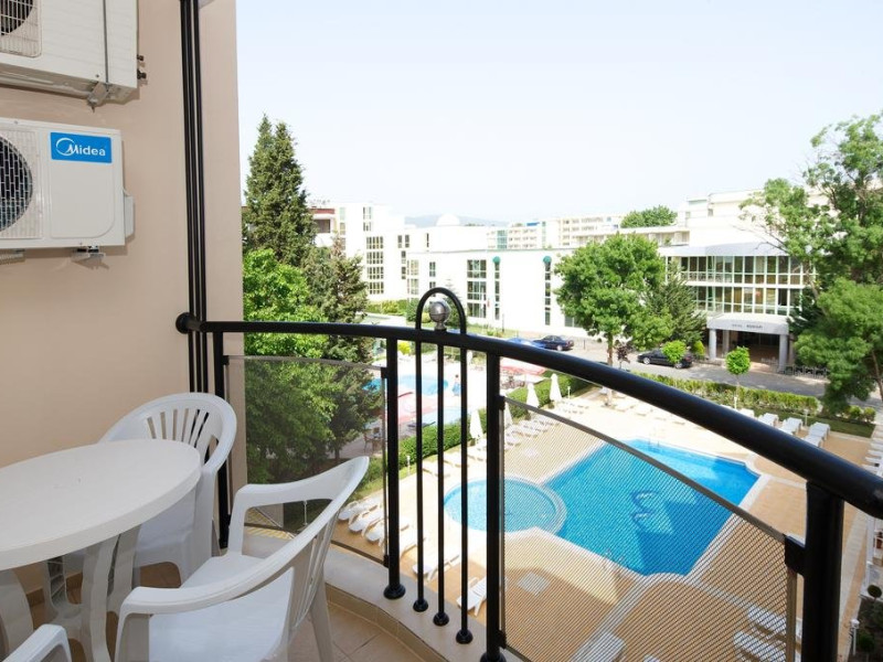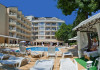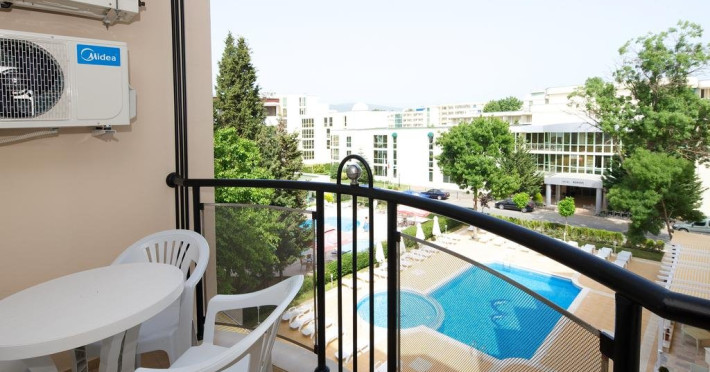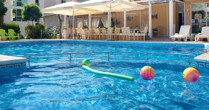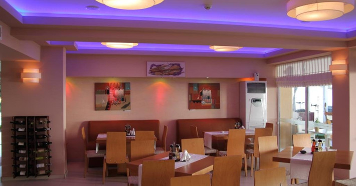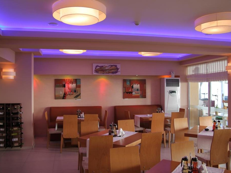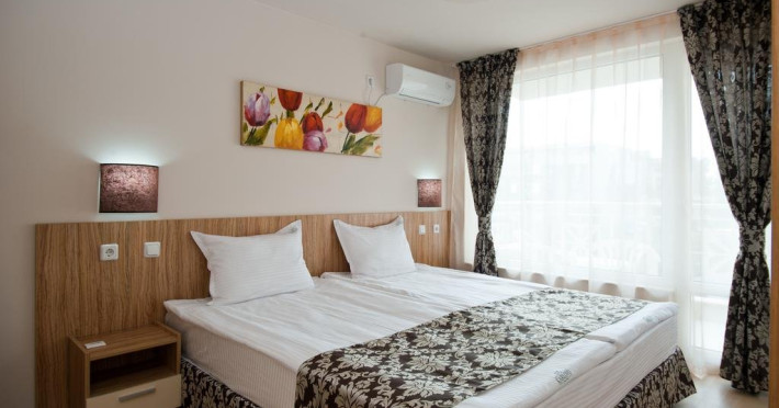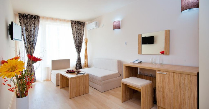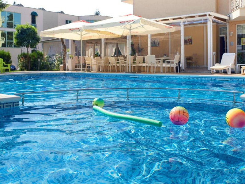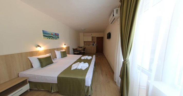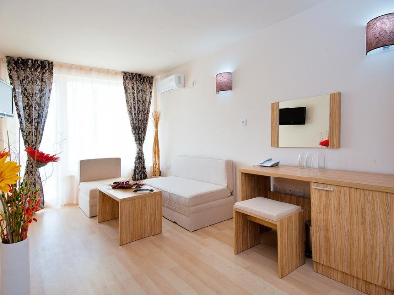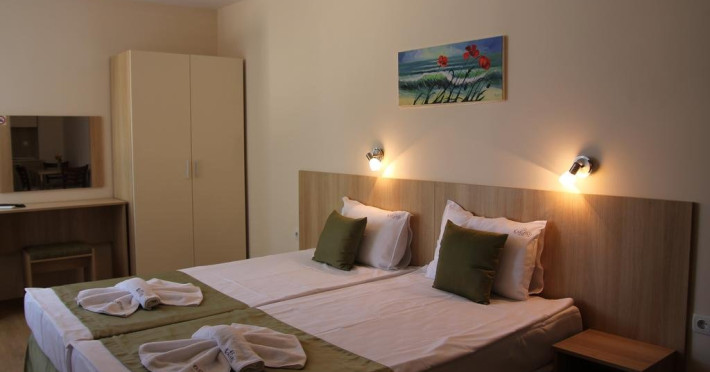 Localizare: este situat la 120 m de plaja, in a doua linie de hoteluri. Capacitate: o cladire de 5 etaje cu 40 camere duble, 4 apartamente 1 dormitor Facilitati hotel: piscina exterioara, aerobic (yoga, exercitii de respiratie), gimnastica acvatica, cabinet medical, masaj, restaurant, bar, seif la receptie (cca 2 eur / zi), lift, internet wireless, birou rent-a-car, biliard, jocuri mecanice, zona de parc si gradini, parcare. Camerele duble (25 mp): doua paturi, aer conditionat, frigider, TV, telefon, baie cu dus, uscator de par, stand uscator de rufe, balcon Apartament 1 dormitor (40mp): pat matrimonial in dormitor, canapea extensibila in living, usa intermediara intre dormitor si living, aer conditionat, frigider, masa de calcat, TV, telefon, baie cu cada, uscator de par, stand uscator de rufe, balcon, Accesul la piscina hotelului, sezlonguri si umbrelute la piscina, Wi-FI (in receptie si lobby bar). Nu este permis accesul cu animale de companie.