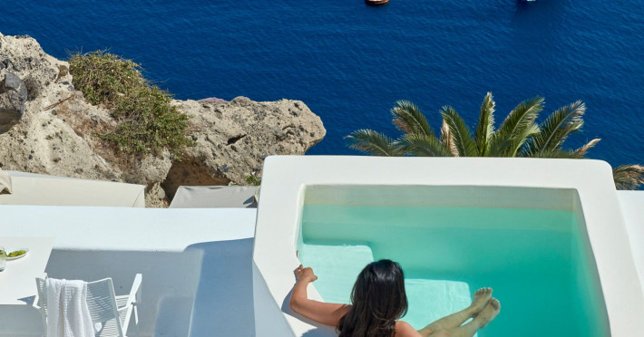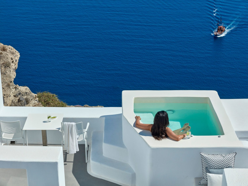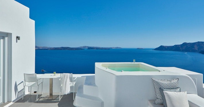 A Villa of seven units, hanging from the cliff, 100 meters above the sea, at the charming and picturesque village of Oia, at the most westerly point of the island.