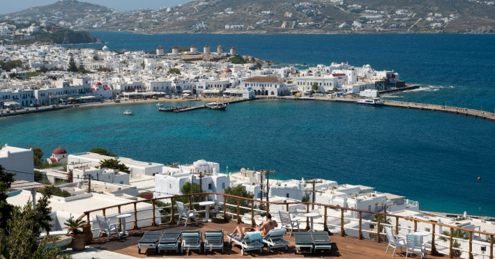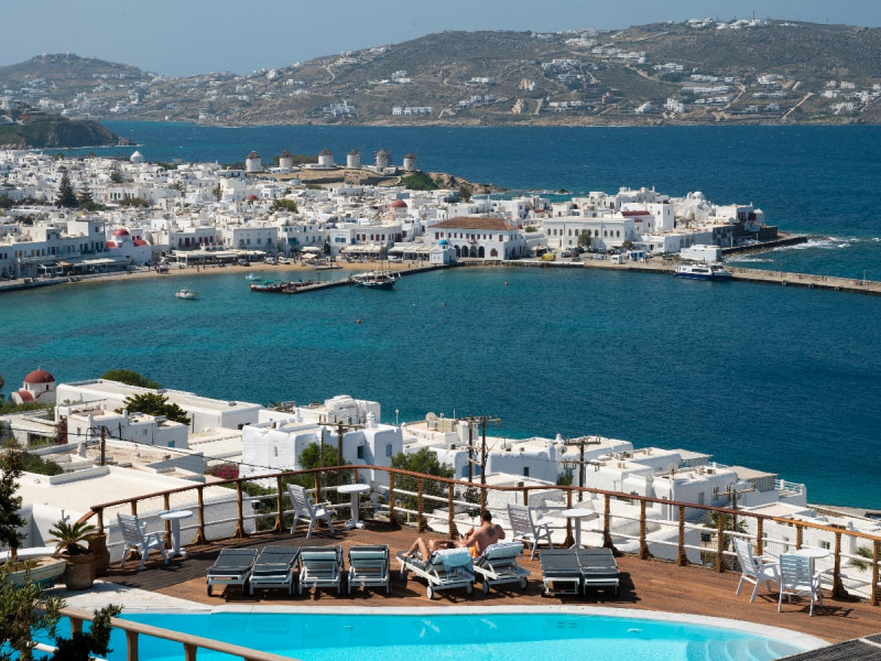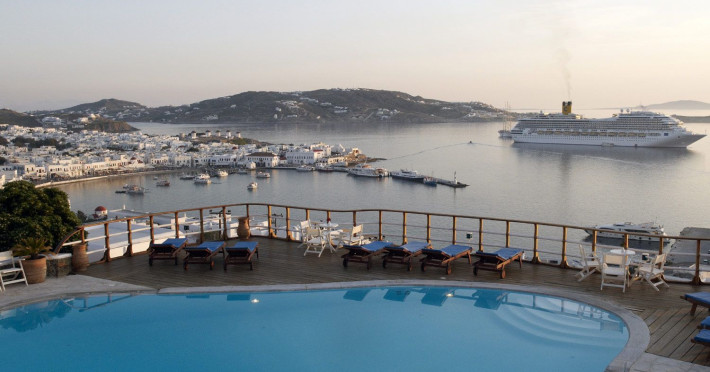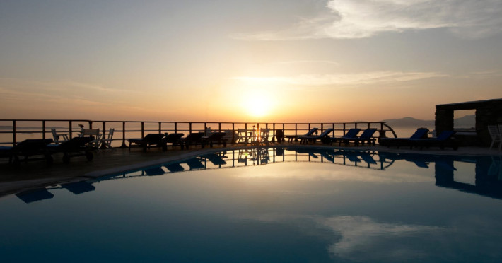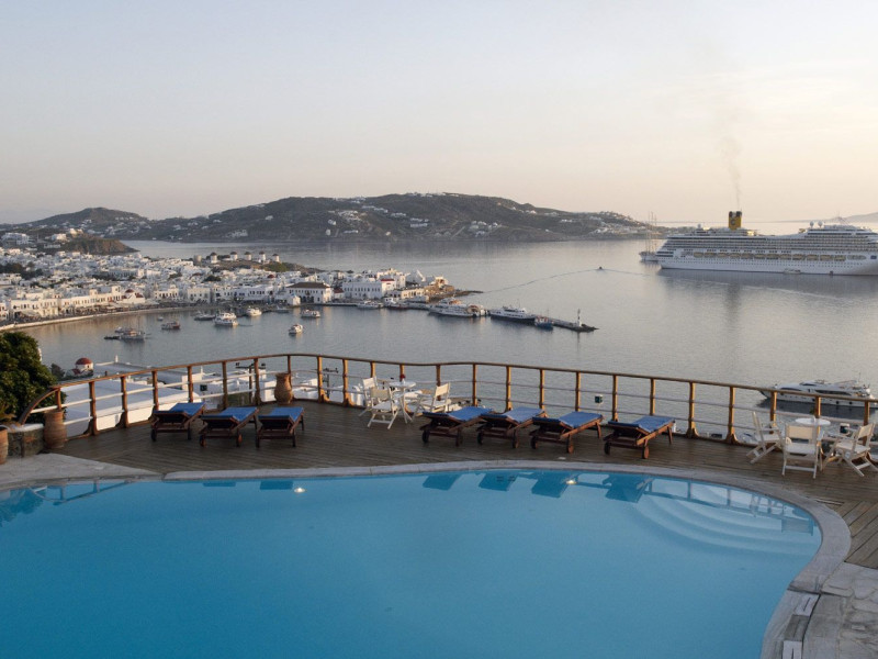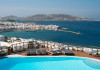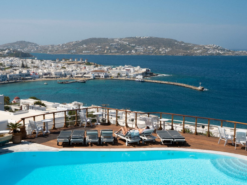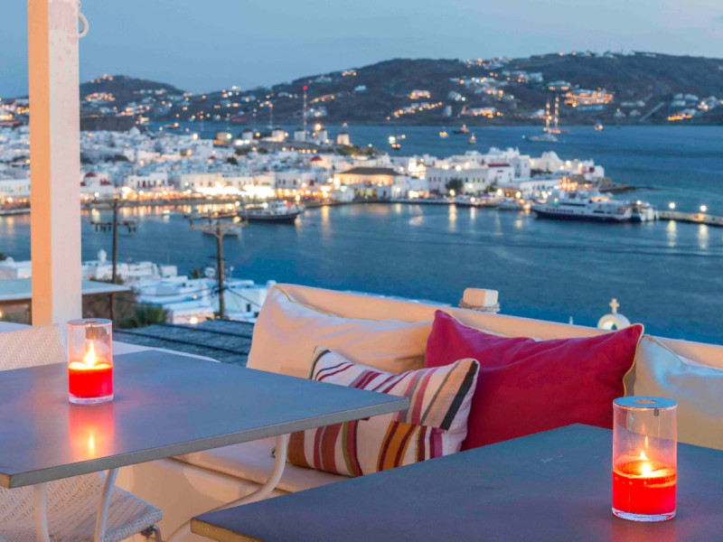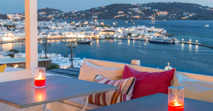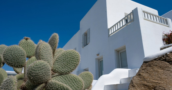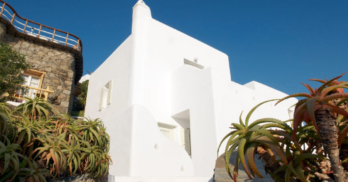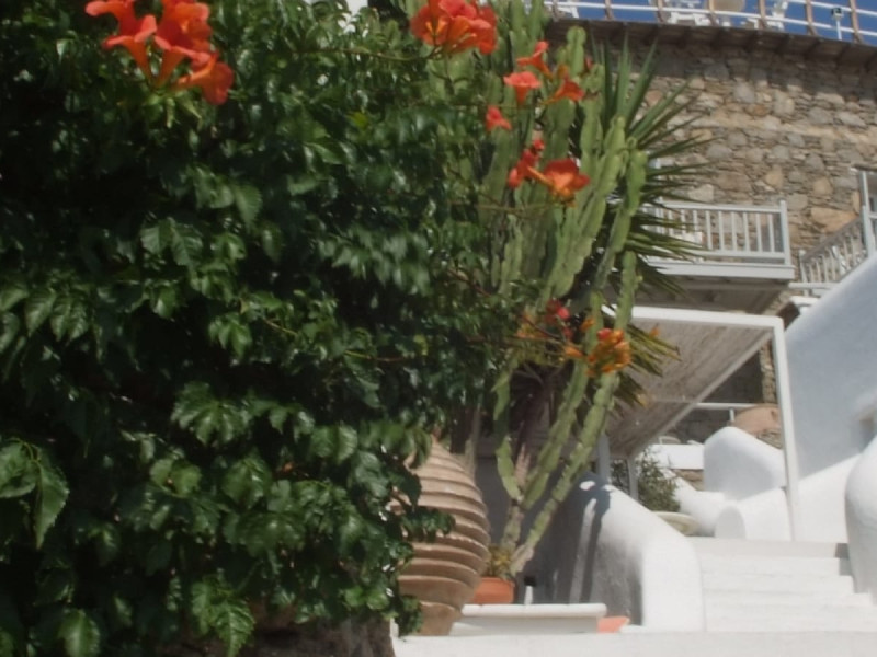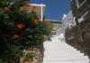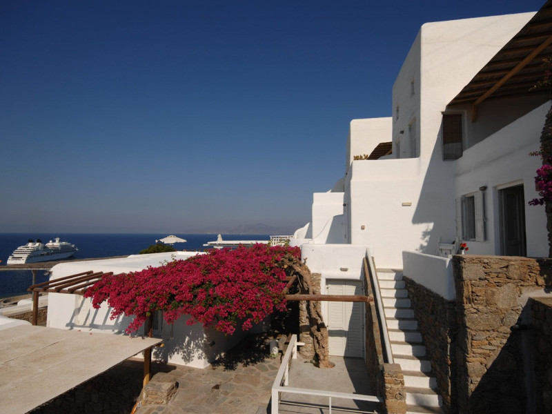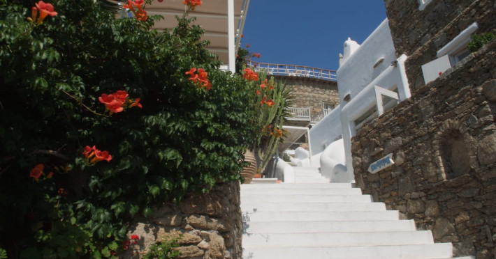 The “Mykonos View Hotel” , one of the premier Mykonos town hotels, is the starting point for your holidays in Mykonos town.These Mykonos rooms are positioned on the slopes of a hill looking down on the fashionable town of Mykonos and the sea beyond. Conjuring up images of the Mykonian days gone by, your approach to this Mykonos town hotel and your holidays in Mykonos town to come, is given the dream-like impression that a stone fortress and a traditional village as Mykonos town rises up through the music of sounds and colours composed by land and sea.The Mykonos hotel buildings emphasize the beauty of Mykonos’ island landscape and blend in harmoniously with their surroundings.The natural building materials of this unique Mykonos town hotel, which were used with great care by local craftsmen, perfectly reflect the vegetation of the island alongside the bright sunshine, and the colors of the sky and sea that draw the perfect holidays in Mykonos.We have shaped the buildings, the walls, the steps and the path-ways of these Mykonos rooms in harmonious and simple forms, with sculpted curves so that they may blend in with land, myth and tradition. Plants and flowers of the Aegean add their colors and scent to the allure of the view of the open sea’s horizon which is enjoyed from all the rooms of this Mykonos town hotel.