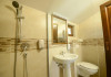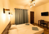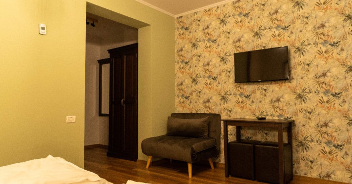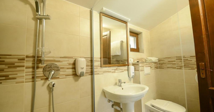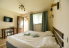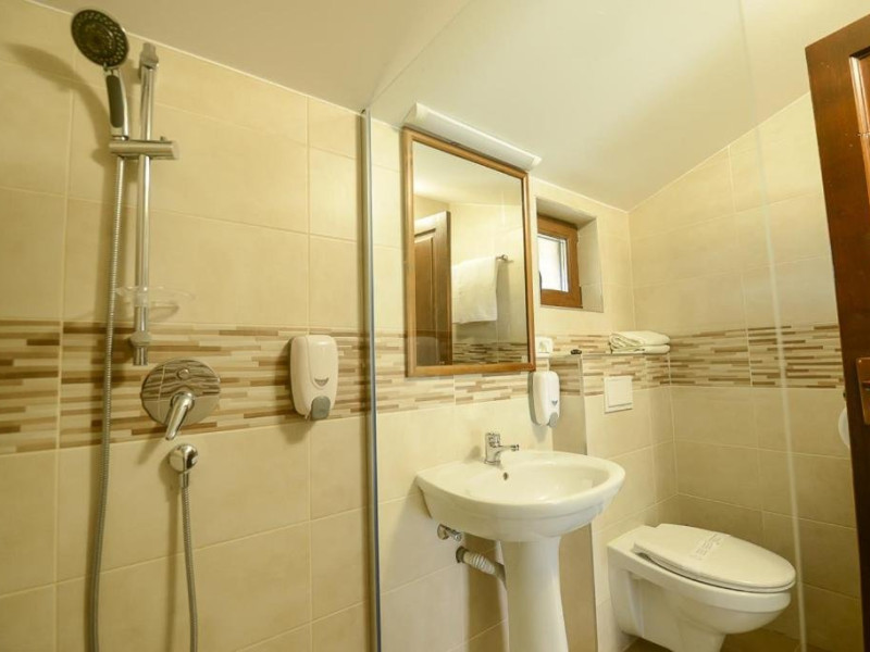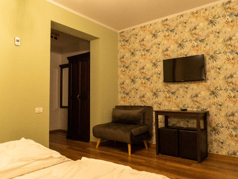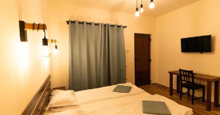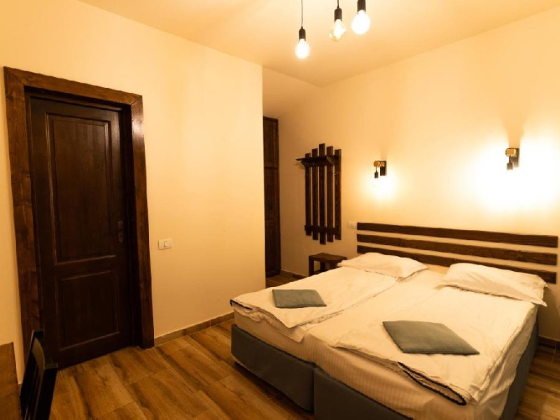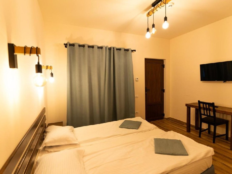 Camere duble INTERIOR: camera de doua persoane 20 mp, situata in cladirea principala, incalzire cu convectoare. Pat matrimonial, 2 noptiere, dulap dublu, umerase, masuta de cafea cu 2 fotolii, baie proprie cu cabina dus, chiuveta, vas WC, oglinda, prosoape, dozator sapun, hartie, televizor prin cablu, internet gratuit.