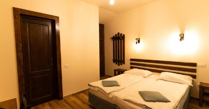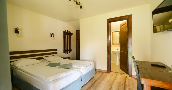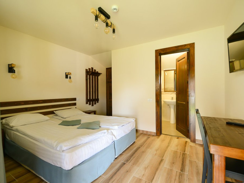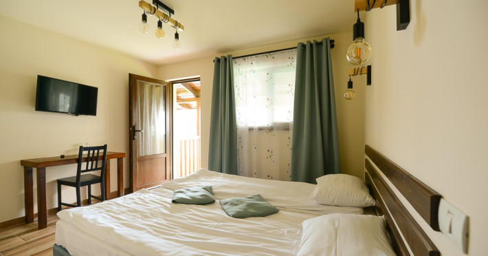Camere duble EXTERIOR: camera de doua persoane 20 mp, situata la 10 m de cladirea principala, incalzire prin pardoseala. Pat matrimonial, 2 noptiere, dulap dublu, umerase, masuta de cafea cu 2 fotolii, baie proprie cu cabina dus, chiuveta, vas WC, oglinda, prosoape, dozator sapun, hartie, televizor prin cablu, internet gratuit.