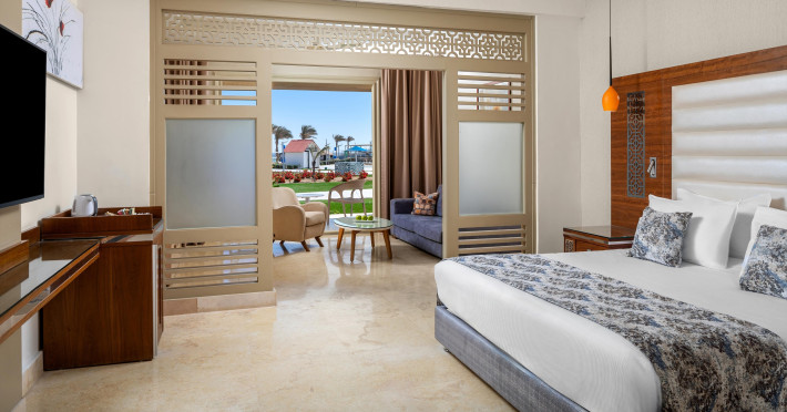 Suita Junior, vedere la piscina: o camera mai spatioasa, cu o zona de living separata optic
