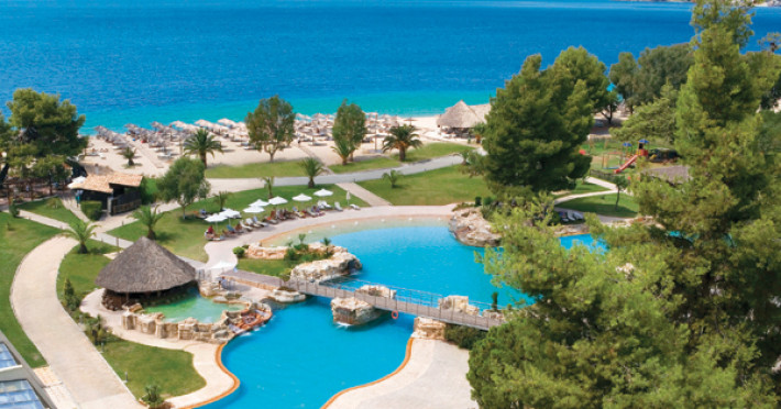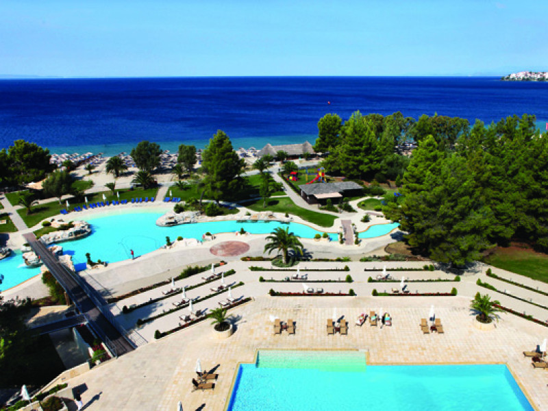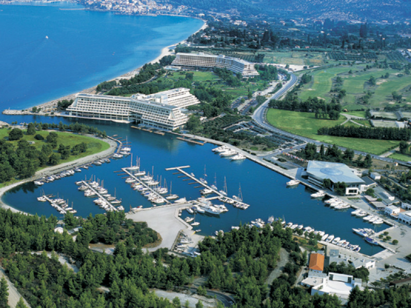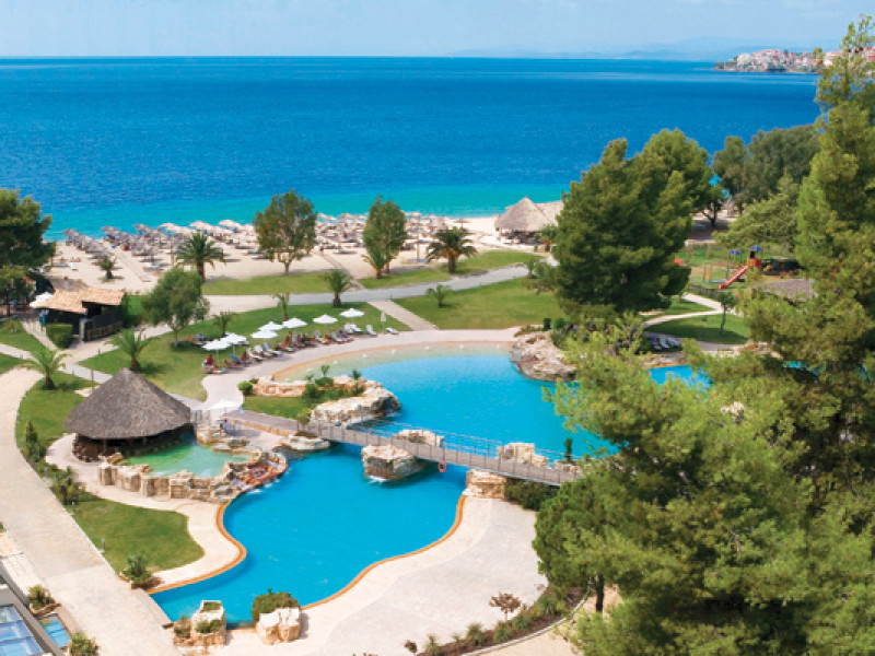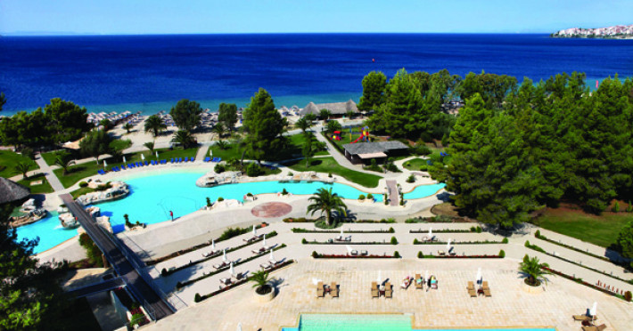 Meliton Thalasso amp; Spa Hotel Deluxe *****, Sithonia ***** Thalasso amp; Spa Hotel, Village Inn ***, Villa Galini. In total sunt 1044 de camere in statiune, precum si in cazino. Meliton Deluxe Thalasso amp; Spa Hotel este sinonim cu luxul. Fatada sa austera, care seamn cu cea a unei nave de croazier, este proiectata de celebrul arhitect Walter Gropius, fondatorul scolii BAUHAUS. Hotelul este format din 480 de camere, inclusiv 93 Suite Junior si 64 apartamente. Arhitectura inovatoare a Meliton-ului este completat de lobby-uri spatioase, restaurante cu buctrie fin, lagune minunate, zone de distractie si de relaxare, precum si de o plaj magnific.