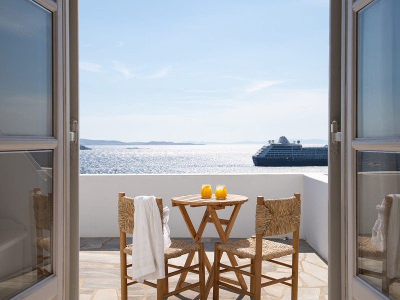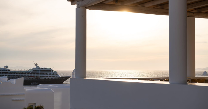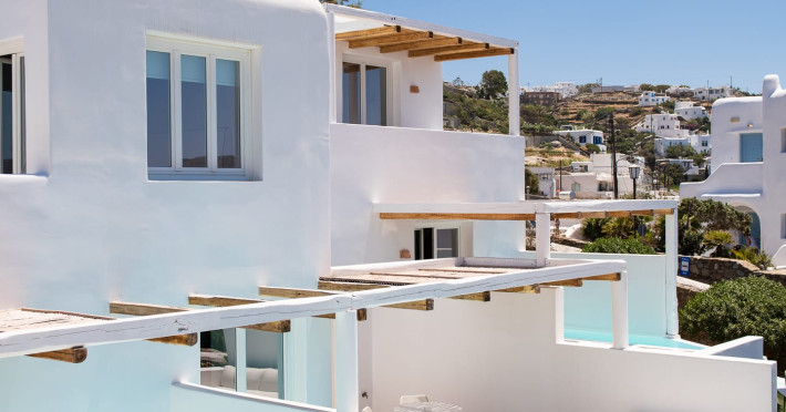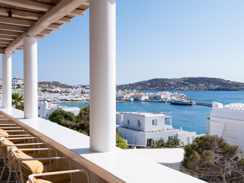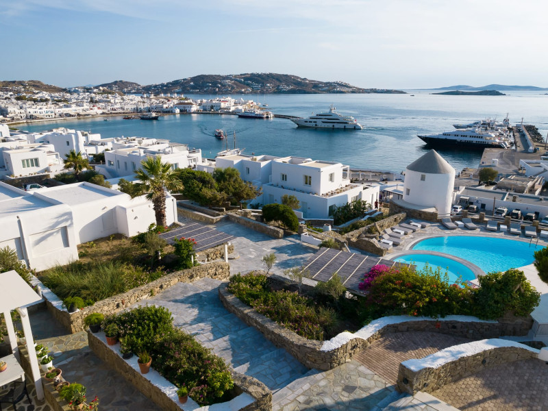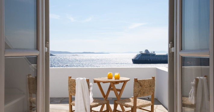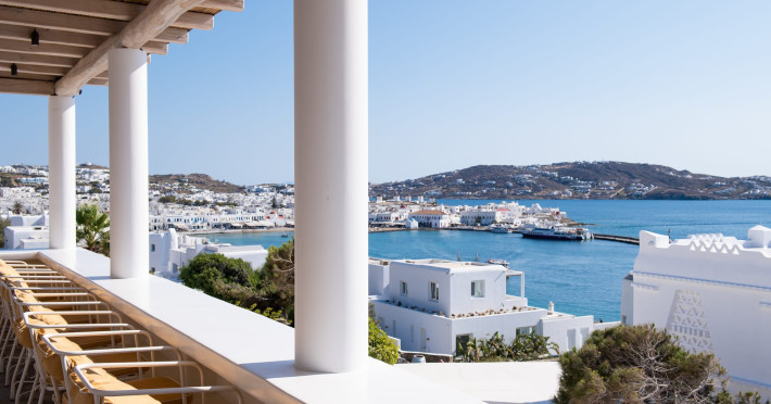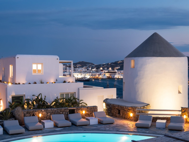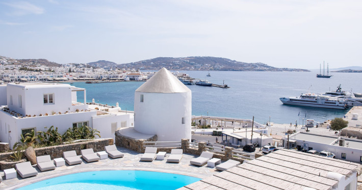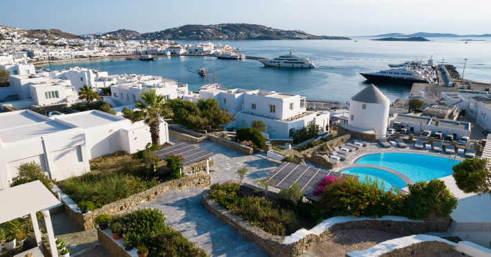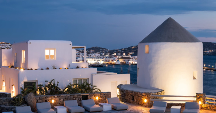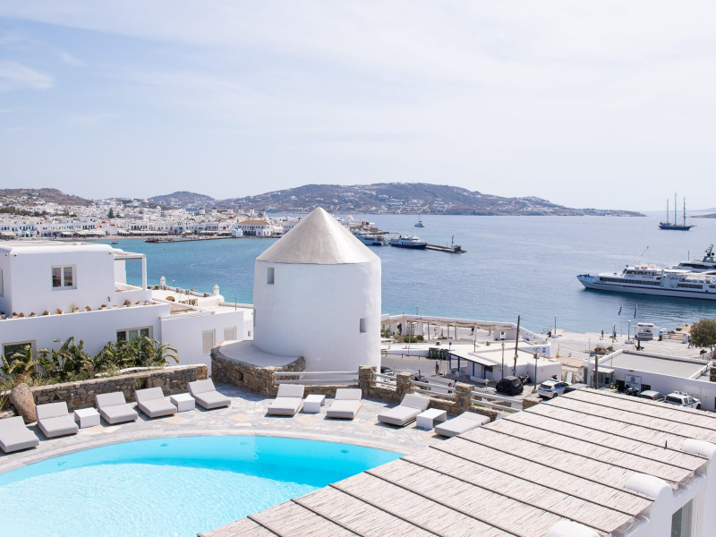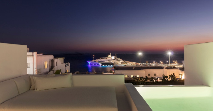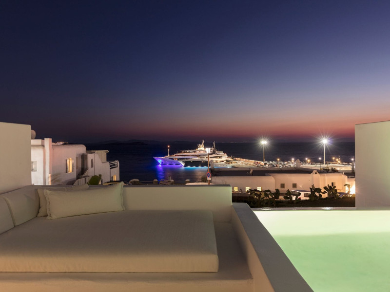 Porto Mykonos boasts the most ideal location in Mykonos town overlooking the vivid pace of the Port and the sparkling colors of the sea. Nestled in one of the most romantic landscapes in Greece this seaside retreat offers the most magical Mykonos town view with flickering lights illuminating the windmills and the historic center. The minimalist luxury rooms and luxury suites feature a combination of authentic Cycladic and modern elements. This luxury hotel in Mykonos town epitomizes the beauty of simplicity in itself.4 stars Hotel in Mykonos townNuzzled in the vibrant town of Mykonos in Greece this 4 star hotel entices its guests with its serene location and the enchanting panoramic views over the azure waters of the Aegean. A luxury 4 star sunset view hotel in Greece offering easy access to the vivacious town, an a la carte restaurant and a fresh water swimming pool.The Porto Mykonos is a traditional and authentic 4 star hotel ideally situated a stone’s throw away from Mykonos town, Greece. The hotel's sea view pool offers magnificent views for sunbathers and, after sunset, it is lit with sparkling lights from town that evidence the active nightlife at the short distance. A 4 star hotel in Mykonos town designed to ensure the ultimate intimacy. The luxury rooms of this sunset view hotel open out onto private terraces allowing guests to enjoy the sunset hues reflecting over the Aegean and the most picturesque Mykonos town view.Mykonos Downtown Luxury HotelIn the heart of Mykonos, the most renowned island of Cyclades in Greece lies the Porto Mykonos sunset view hotel. Just a breath away from the bustling town in Mykonos downtown the hotel beautifully combines tranquil and comfortable accommodation with traditional architecture & style and impeccable service.View also our Sisters Hotels Terra Maria Butique Town hotel and Hotel Tagoo in Mykonos.