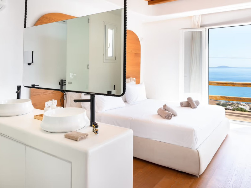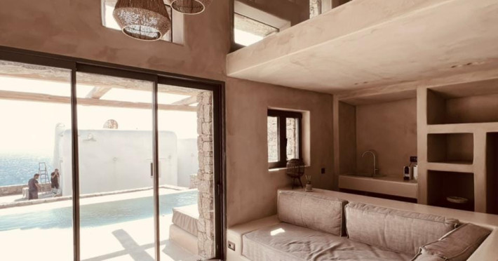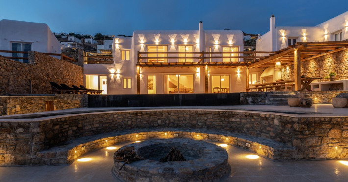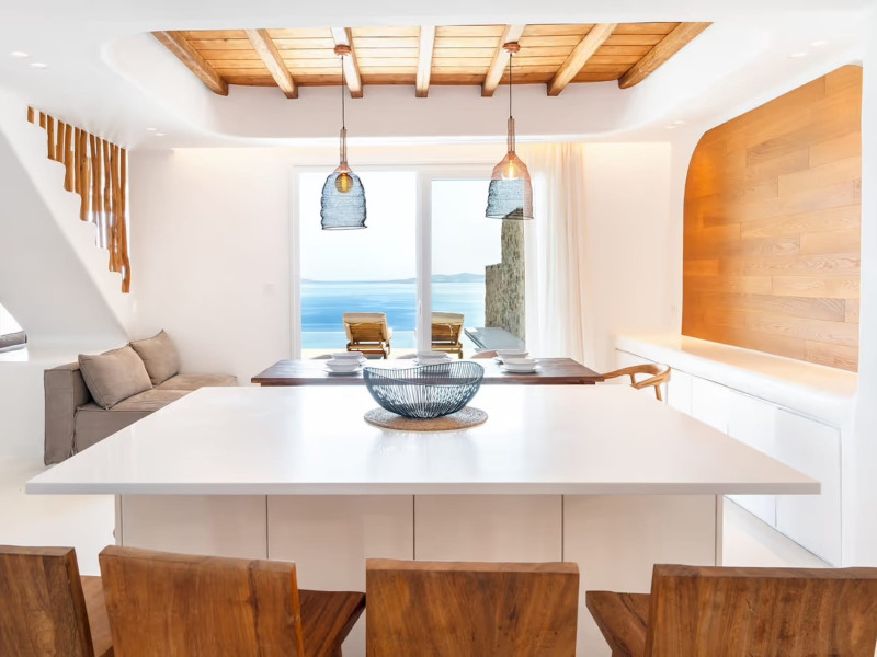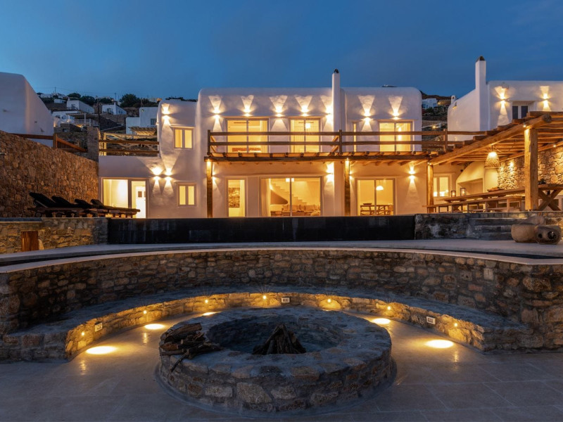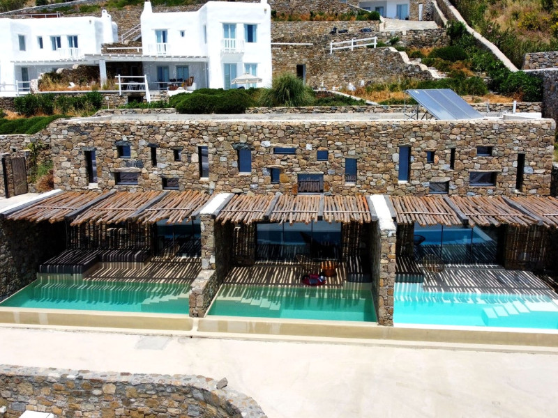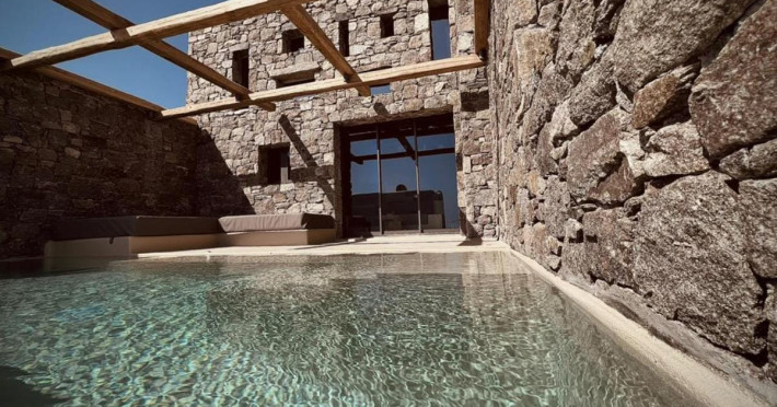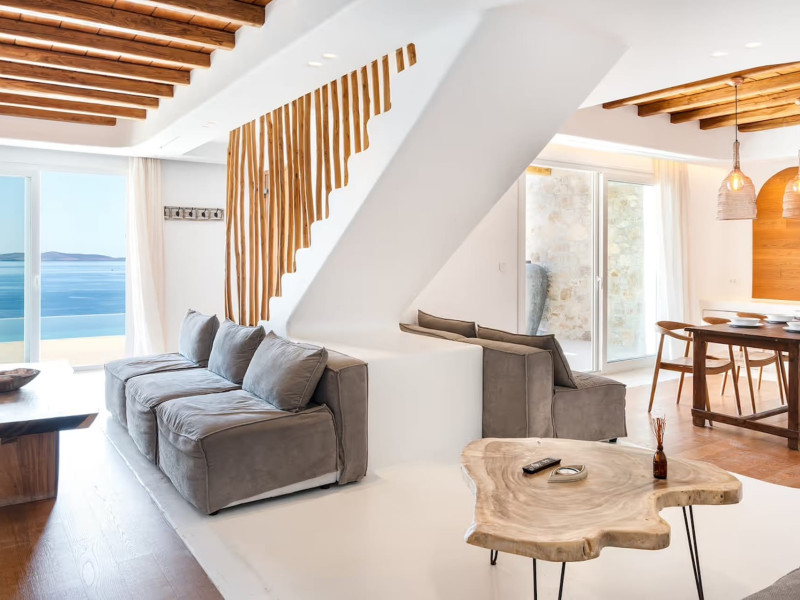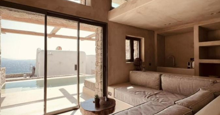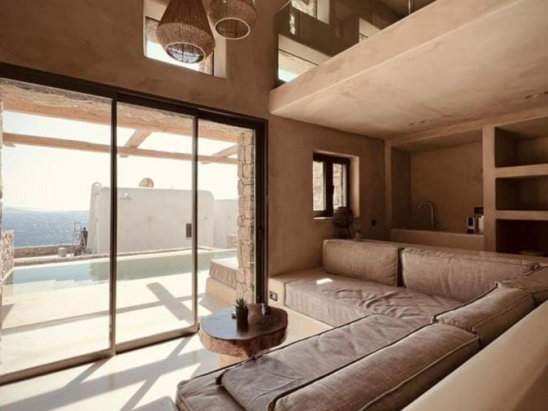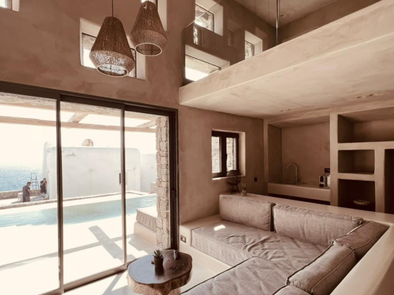Ria Mar Villas and Suites by Live&Travel is an exclusive complex perched on the serene hills of Choulakia, offering five independent luxury units: a 5-bedroom villa with a private infinity pool, Jacuzzi, and hammam, a 3-bedroom villa with a private pool, and three 1-bedroom suites, each boasting their own private pool. These properties are designed in a modern boho style that blends Cycladic minimalism with contemporary elegance, featuring panoramic views of the Aegean Sea and mesmerizing sunsets. Highlights: 5-Bedroom Villa: Sleeps up to 10 guests, with en-suite bedrooms, a fully equipped kitchen, and spacious indoor and outdoor living areas. It includes a 48 m² infinity pool, a 22 m² Jacuzzi, a hammam steam room, and an outdoor firepit. 3-Bedroom Villa: Perfect for families or groups, with expansive sea views, private pool, and elegant indoor spaces. 1-Bedroom Suites: Each suite is thoughtfully designed, with mezzanine-style sleeping areas, airy interiors, and private pools. Located just a short drive from Mykonos Town and near Agios Stefanos Beach, the complex is ideal for those seeking privacy, relaxation, and easy access to the island’s vibrant attractions. Whether you're planning a tranquil escape or a lively group retreat, Ria Mar Villas and Suites offer a tailored luxury experience infused with authentic Mykonian charm