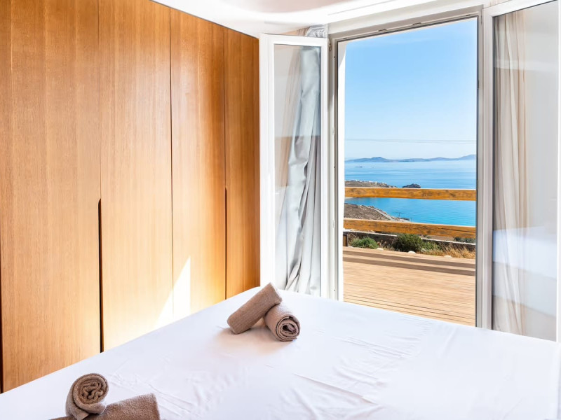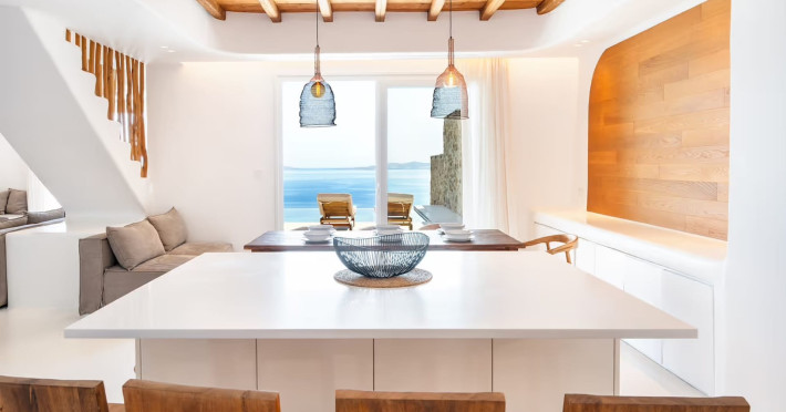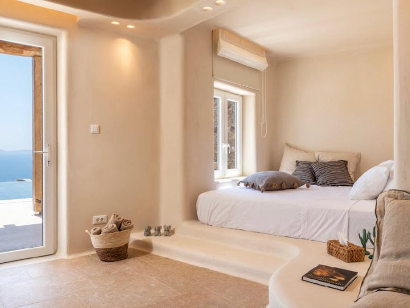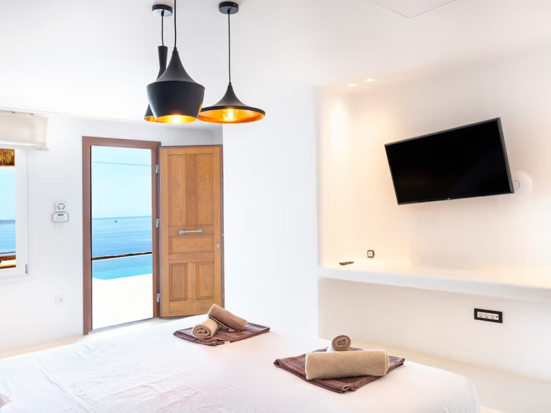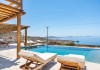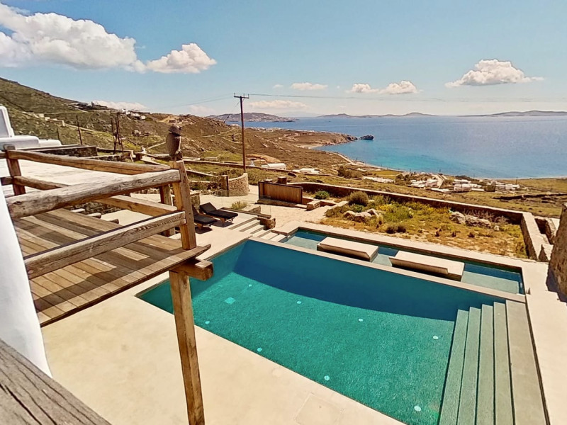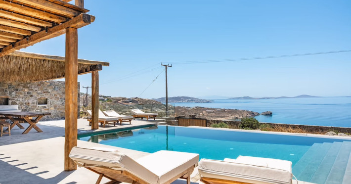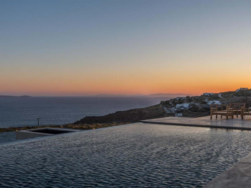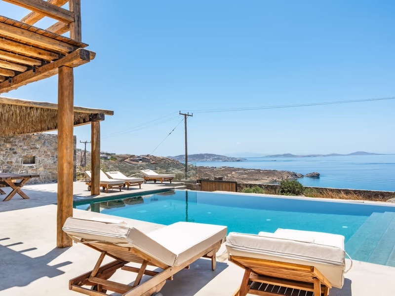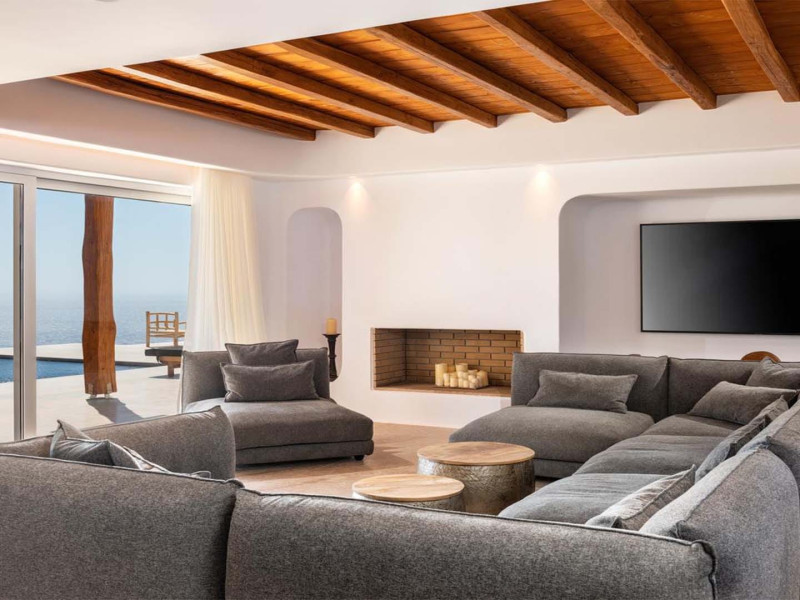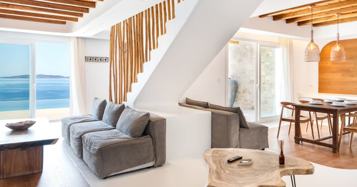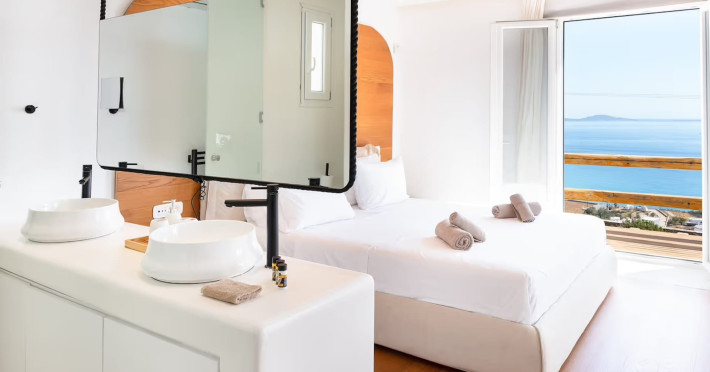 Ria Mar Villas and Suites by Live&Travel is an exclusive complex perched on the serene hills of Choulakia, offering five independent luxury units: a 5-bedroom villa with a private infinity pool, Jacuzzi, and hammam, a 3-bedroom villa with a private pool, and three 1-bedroom suites, each boasting their own private pool. These properties are designed in a modern boho style that blends Cycladic minimalism with contemporary elegance, featuring panoramic views of the Aegean Sea and mesmerizing sunsets. Highlights: 5-Bedroom Villa: Sleeps up to 10 guests, with en-suite bedrooms, a fully equipped kitchen, and spacious indoor and outdoor living areas. It includes a 48 m² infinity pool, a 22 m² Jacuzzi, a hammam steam room, and an outdoor firepit. 3-Bedroom Villa: Perfect for families or groups, with expansive sea views, private pool, and elegant indoor spaces. 1-Bedroom Suites: Each suite is thoughtfully designed, with mezzanine-style sleeping areas, airy interiors, and private pools. Located just a short drive from Mykonos Town and near Agios Stefanos Beach, the complex is ideal for those seeking privacy, relaxation, and easy access to the island’s vibrant attractions. Whether you're planning a tranquil escape or a lively group retreat, Ria Mar Villas and Suites offer a tailored luxury experience infused with authentic Mykonian charm