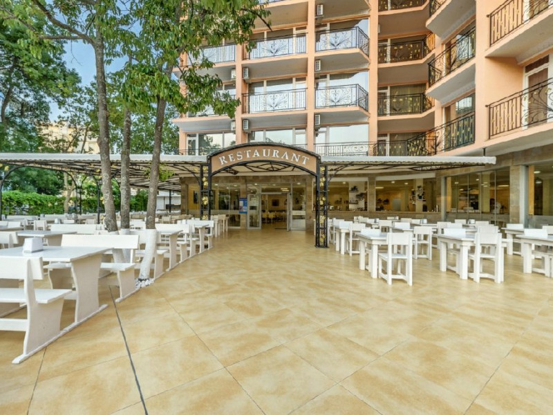 Mancare si bauturi: - Mic dejun tip bufet /07.30-10.00 h/ - o varietate de preparate calde si reci, specialitati din oua, o varietate de produse lactate, carnati si branzeturi, produse de patiserie, cereale, fructe, SHO W cooking, cafea si ceai, apa, bauturi racoritoare - Pranz tip bufet /12.00-14.00 h/ - o selectie de salate si supe proaspete, bogat variate din preparate bulgaresti si internationale, preparate vegetariene si din carne, paste, o selectie de produse de panificatie, bufet dulci cu o varietate de deserturi, SHO W cooking, cafea si ceai, apa, bauturi racoritoare, bere, bauturi alcoolice locale - Gustare de dupa-amiaza /14:30-17:00 h/ (BBQ/Snack bar sau Restaurant principal) - Gustari calde si reci: sandvisuri, pizza, produse de patiserie, croissante - Cina tip bufet /18.00-21.00 h/ - o selectie de salate si supe proaspete, bogat variate din preparate bulgaresti si internationale, preparate vegetariene si din carne, paste, o selectie de produse de panificatie, bufet dulci cu o varietate de deserturi, SHO W cooking, soft bauturi, bere, vin rosu, vin alb, bauturi alcoolice locale *Cina tematica - o data pe saptamana
