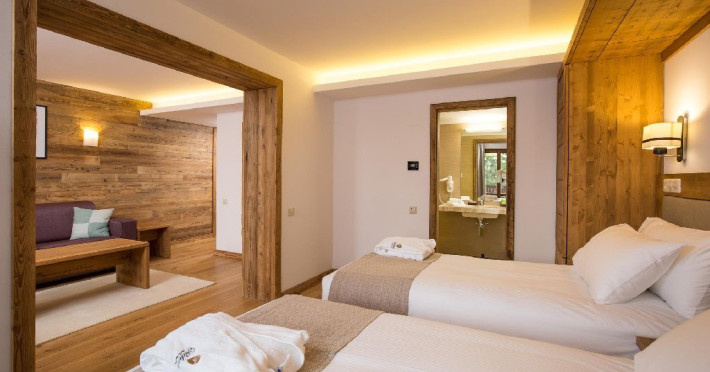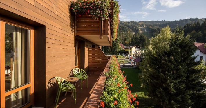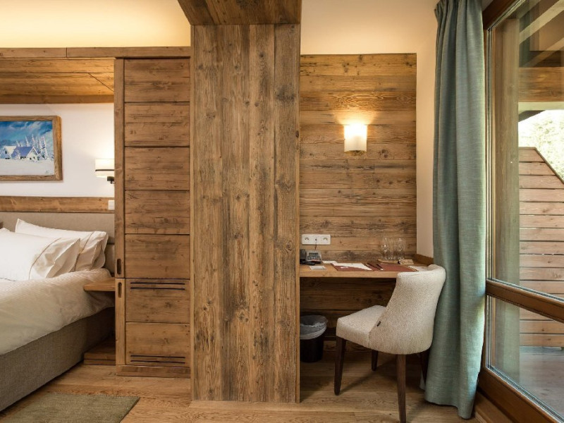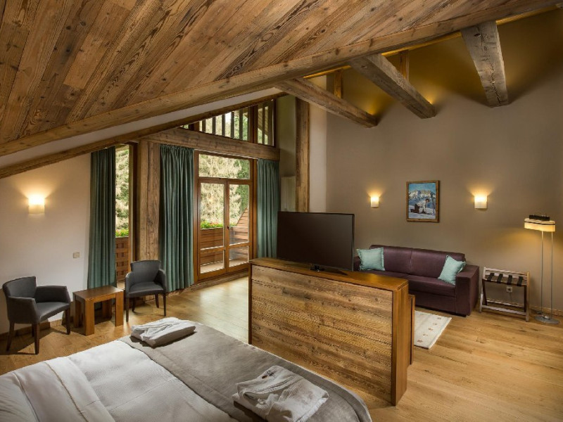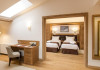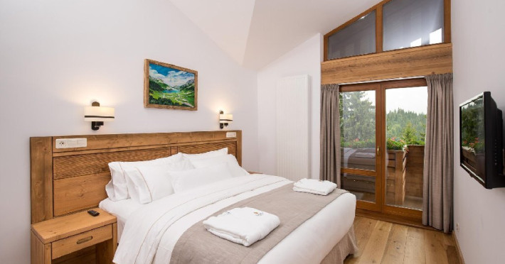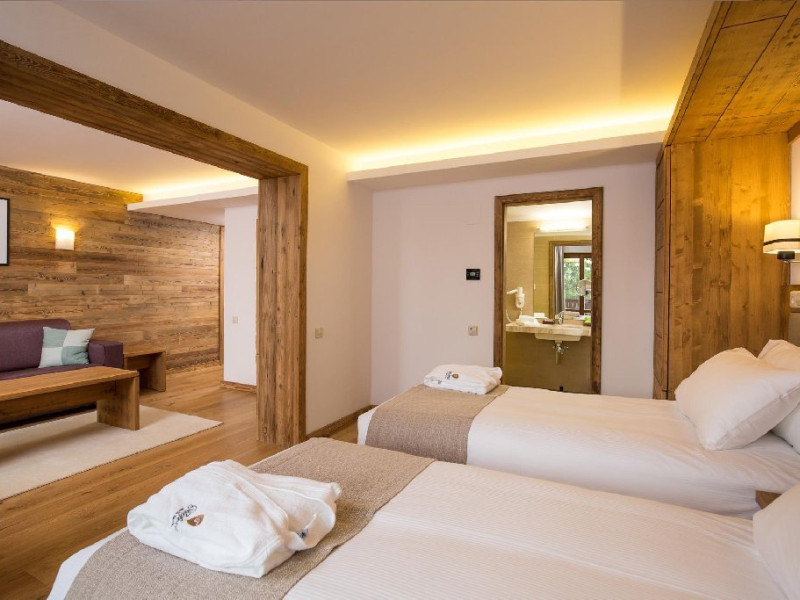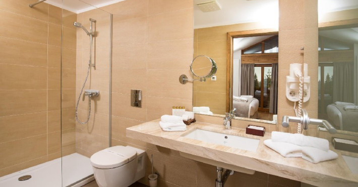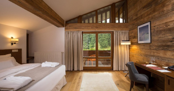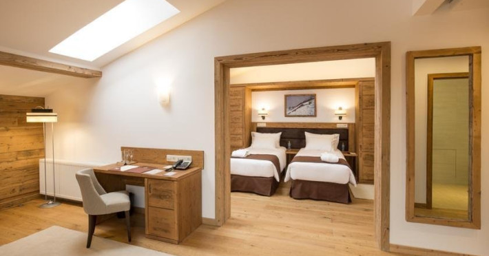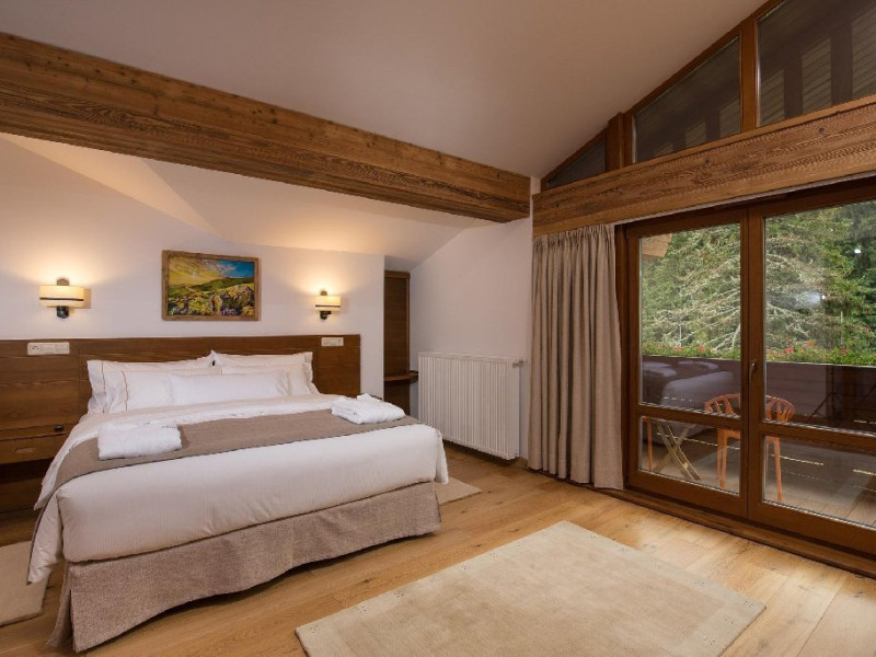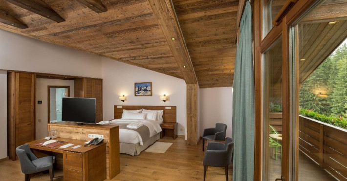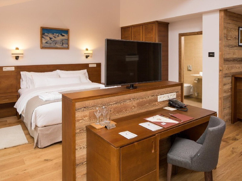 10 CAMERE DUBLE SUPERIOARE - 31 mp, Se poate opta pentru pat matrimonial sau paturi separate, camera beneficiind de urmatoarele dotari: birou, TV, telefon, seif, minibar, conexiune wireless la internet gratuita si control individual al temperaturii in camera. Camera de baie are cada sau cabina de dus, uscator de par, oglinda pentru cosmetica, halat de baie, papuci si o atmosfera de relaxare minunata. Balconul spatioasei camere ofera o imagine montana de vis.