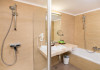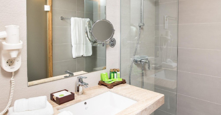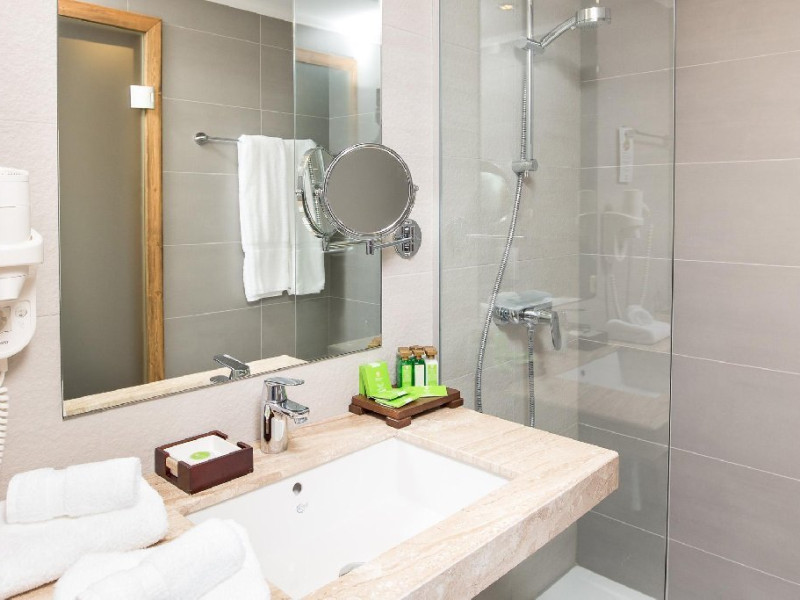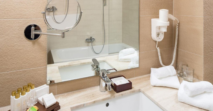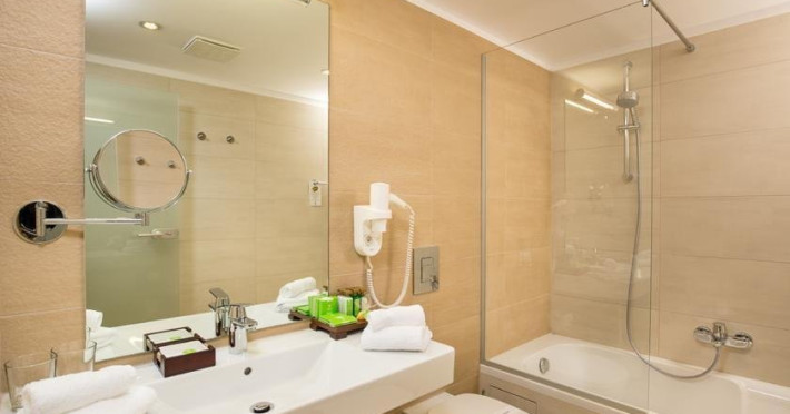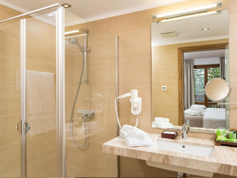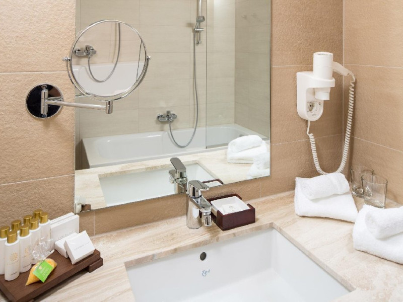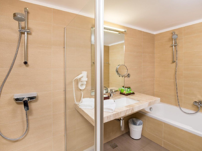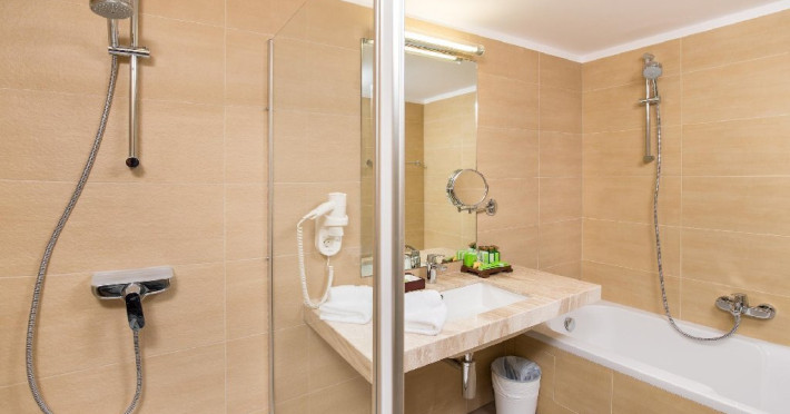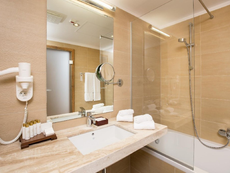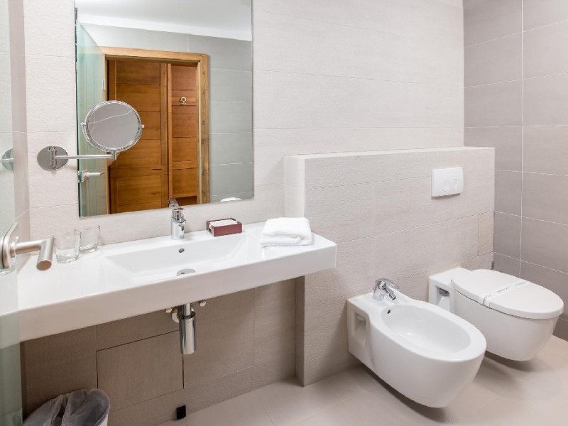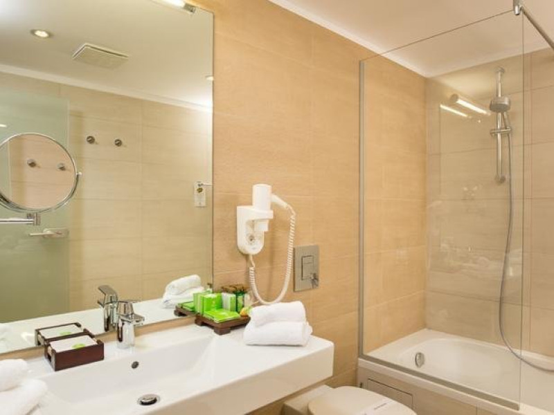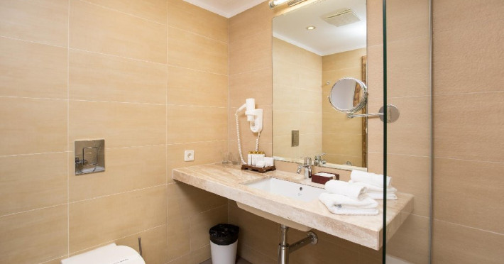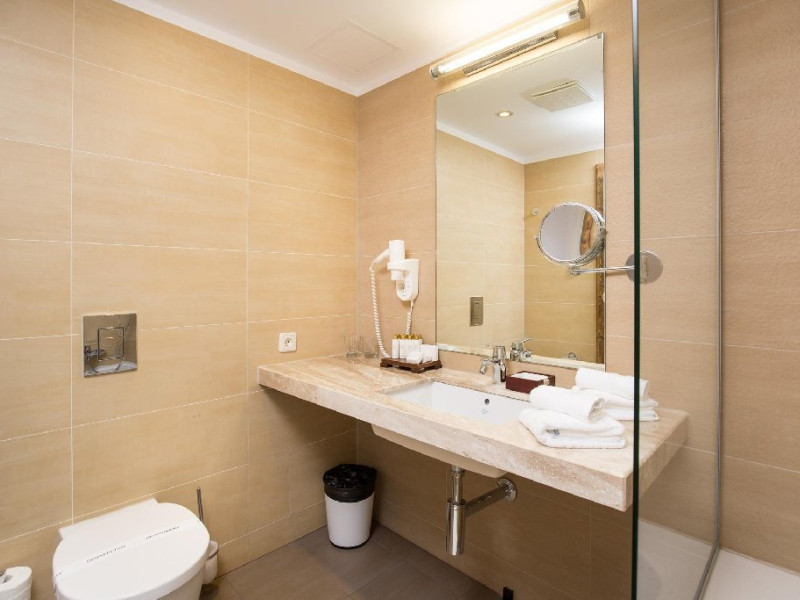 47 CAMERE DUBLE STANDRAD - 23 mp, dotate cu birou de lucru, TV, minibar, conexiune internet wireless gratuita, control individual al temperaturii, baie cu cada sau cabina de dus, uscator de par, oglinda pentru cosmetica, halat de baie si papuci. Se poate opta pentru pat matrimonial sau paturi separate. Majoritatea camerelor au balcon cu spatiu pentru relaxare, scaune si masuta