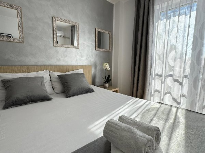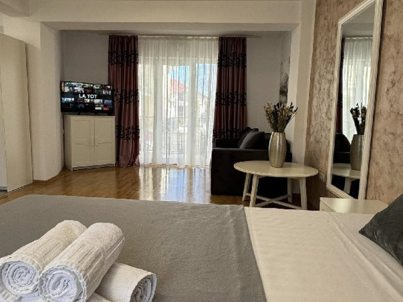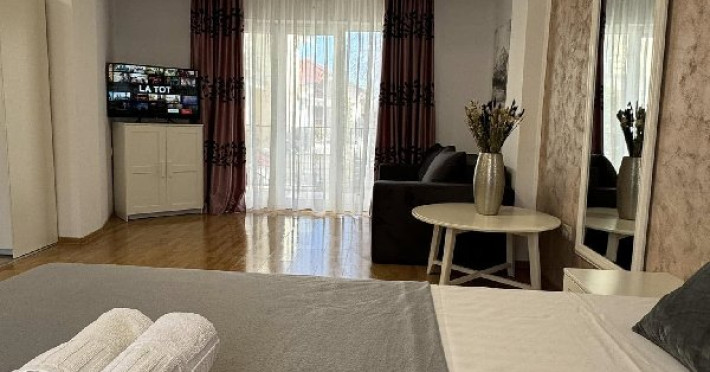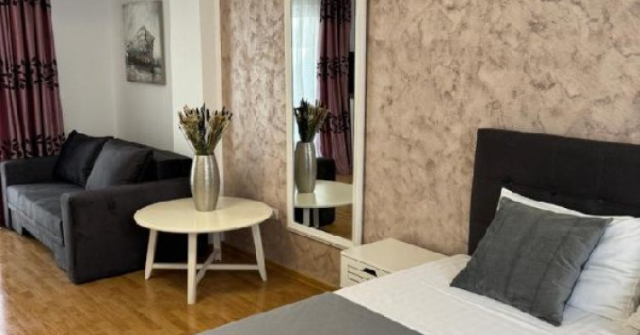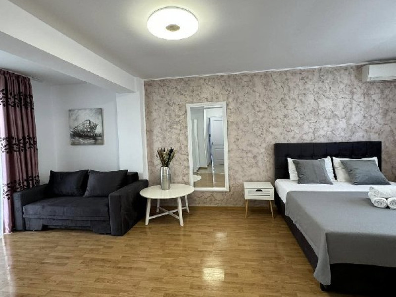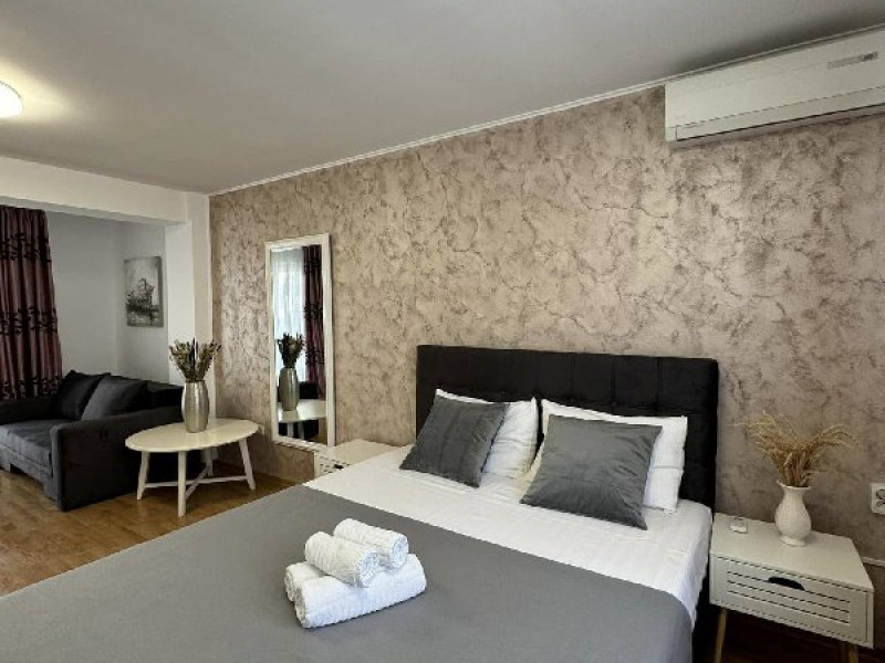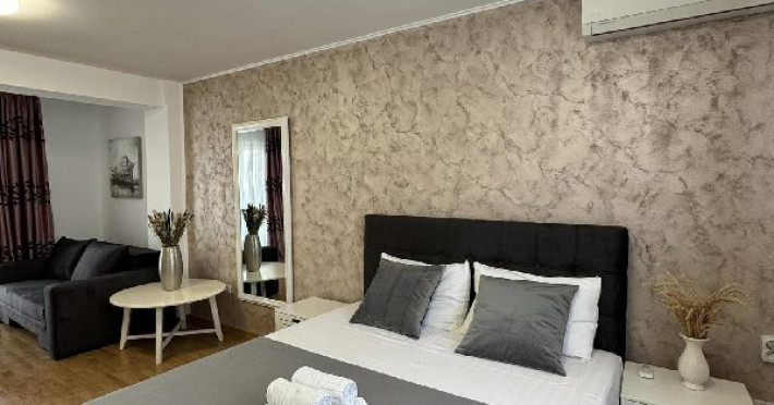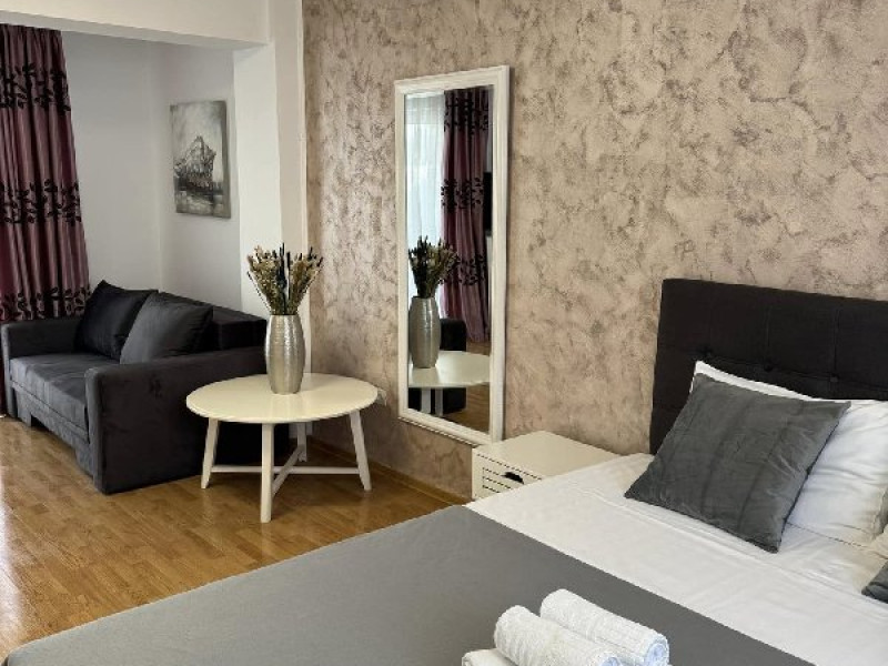 Apartament tip studio: dormitor matrimonial, living cu canapea extensibila, 1 baie. Capacitate maxima 3 adulti + un copil.