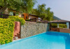 Infinity style pool and large sitting and dinning areas are incorporated in a