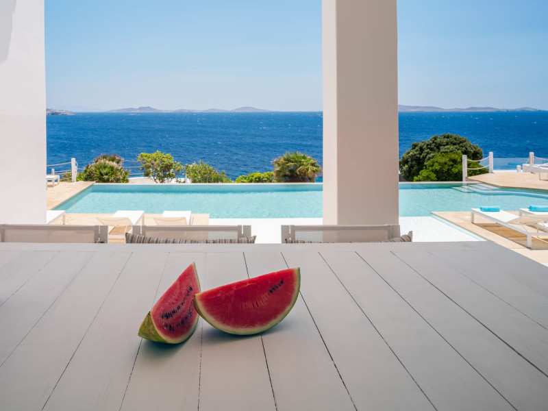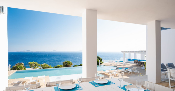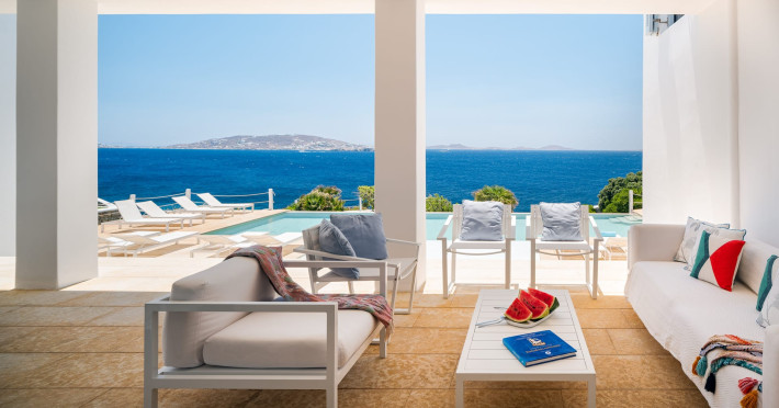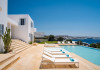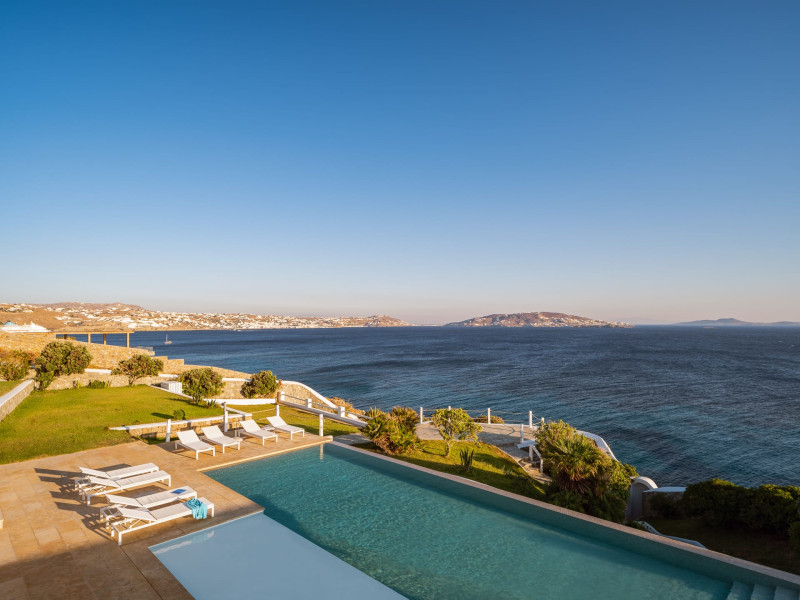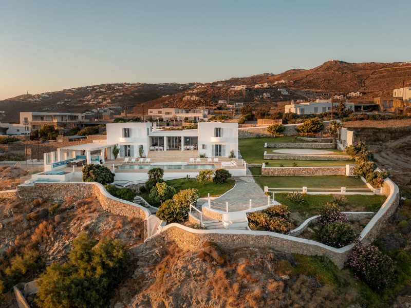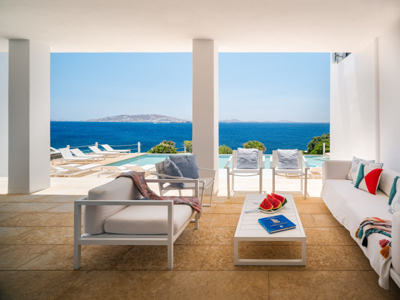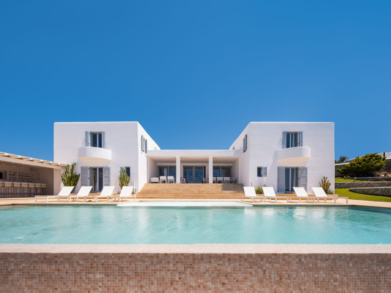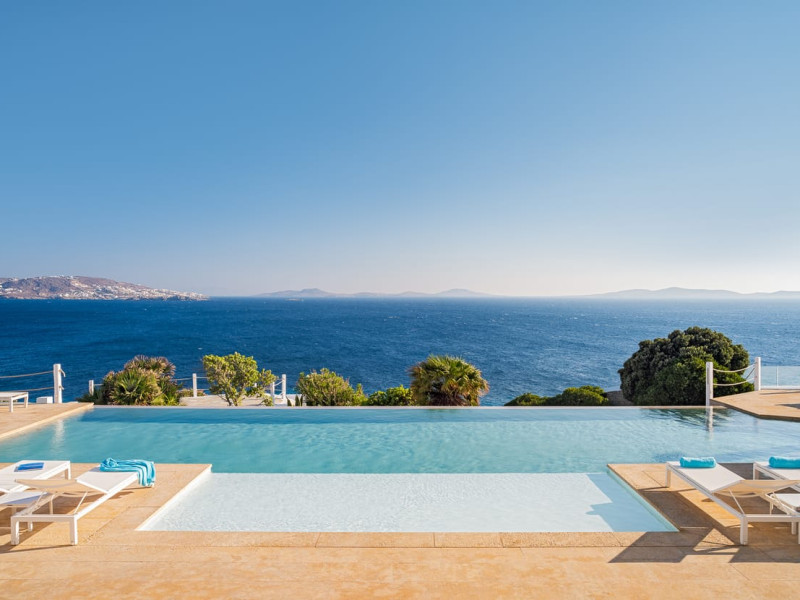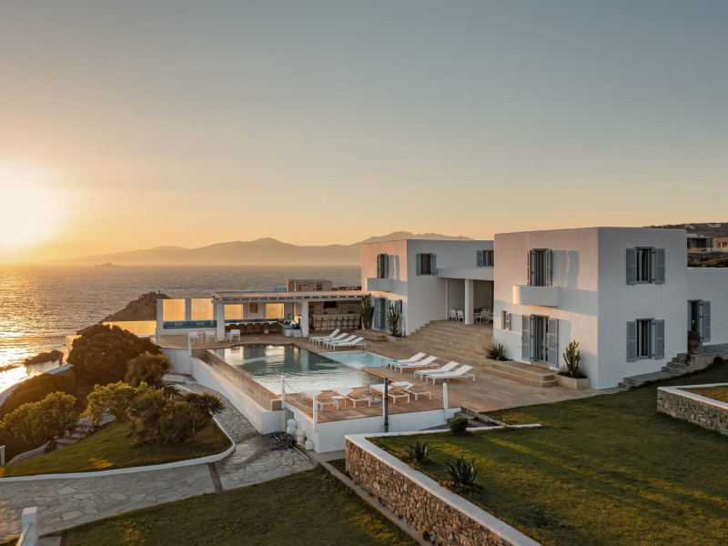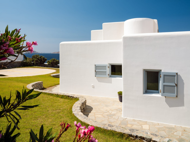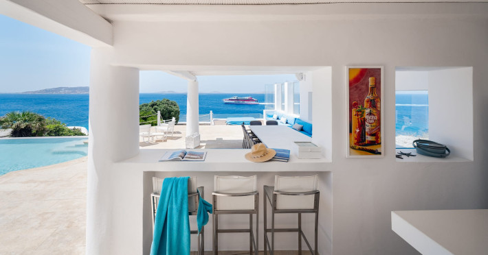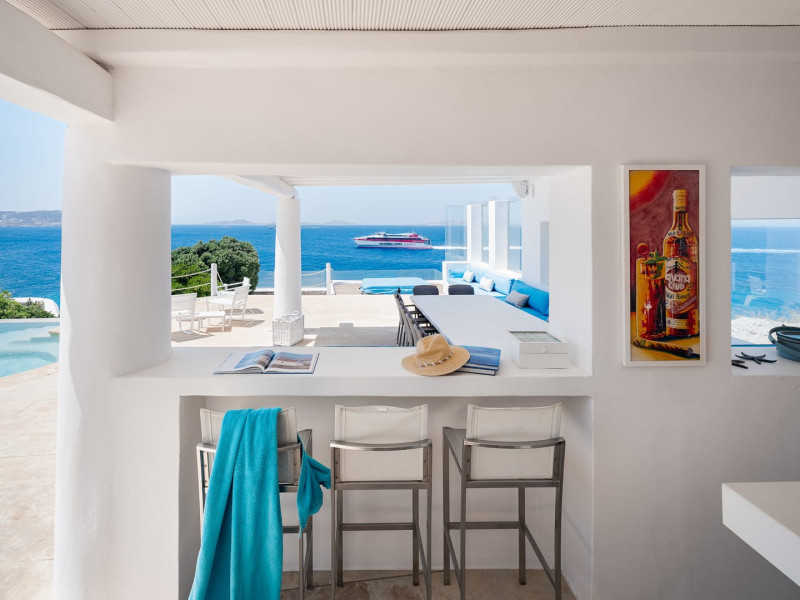 About the VillaNestled in the serene village of Agios Stefanos, just 3 km northwest of Mykonos town, Villa Skye is a captivating fusion of traditional Mykonian architecture and modern luxury. Originally built in the 1970s, this iconic seafront property has undergone a meticulous renovation to preserve its authentic charm while introducing top-tier amenities. Featuring 7 spacious bedrooms, a private swimming pool, a jacuzzi, a helipad, and an array of luxurious indoor and outdoor spaces, Villa Skye offers the ultimate retreat for guests seeking elegance and tranquility.The ProjectVilla Skye stands as a tribute to Mykonos' timeless allure. This renovated beachfront villa epitomizes island luxury with its thoughtfully curated spaces. From its chic interiors to its expansive outdoor areas, the property encapsulates the essence of Mykonian style, earning its reputation as “the most Mykonian of Mykonian villas.”The AreaMykonos needs no introduction, celebrated worldwide for its vibrant nightlife, stunning beaches, and picturesque villages. Agios Stefanos, a quaint village named after the beachside church perched at the bay’s edge, offers a peaceful contrast to the island’s bustling center. Located just a 15-minute drive from Mykonos town, Villa Skye is perfectly situated to provide both seclusion and convenience.