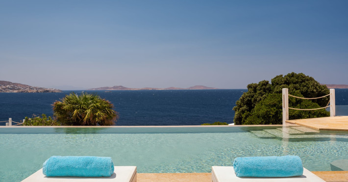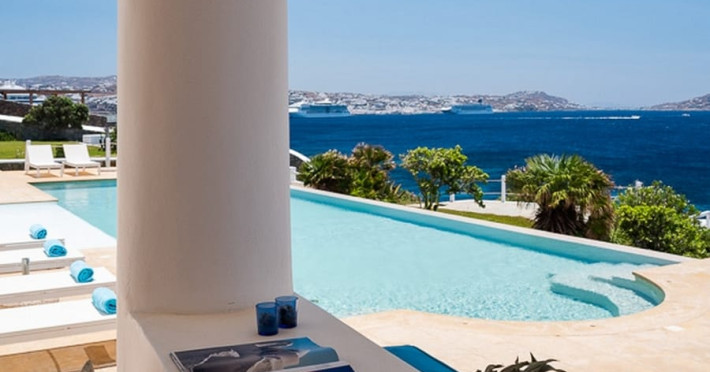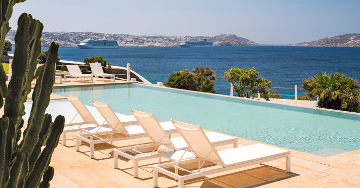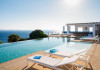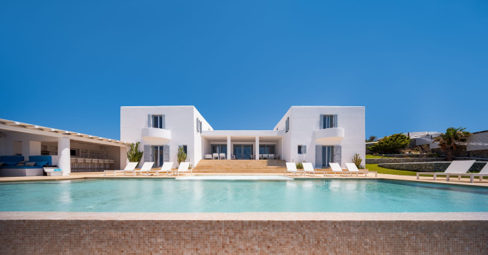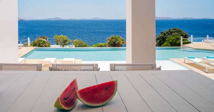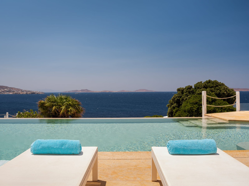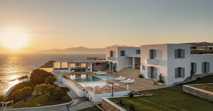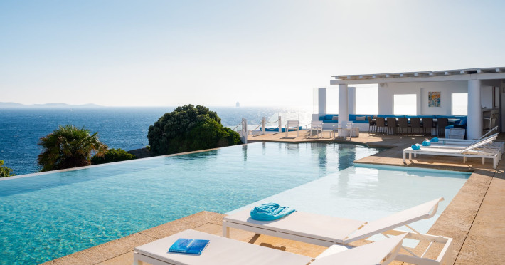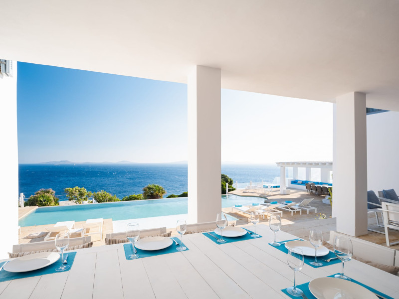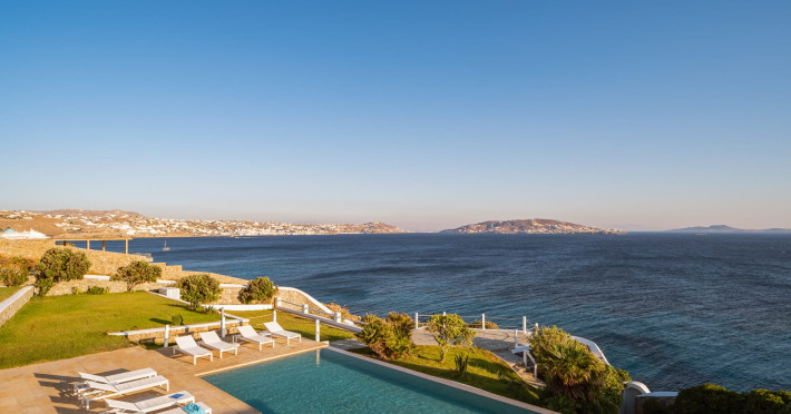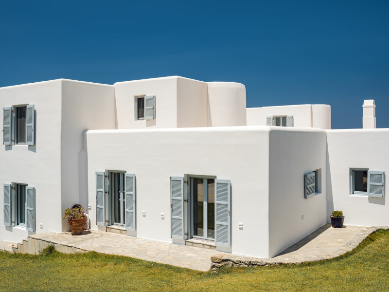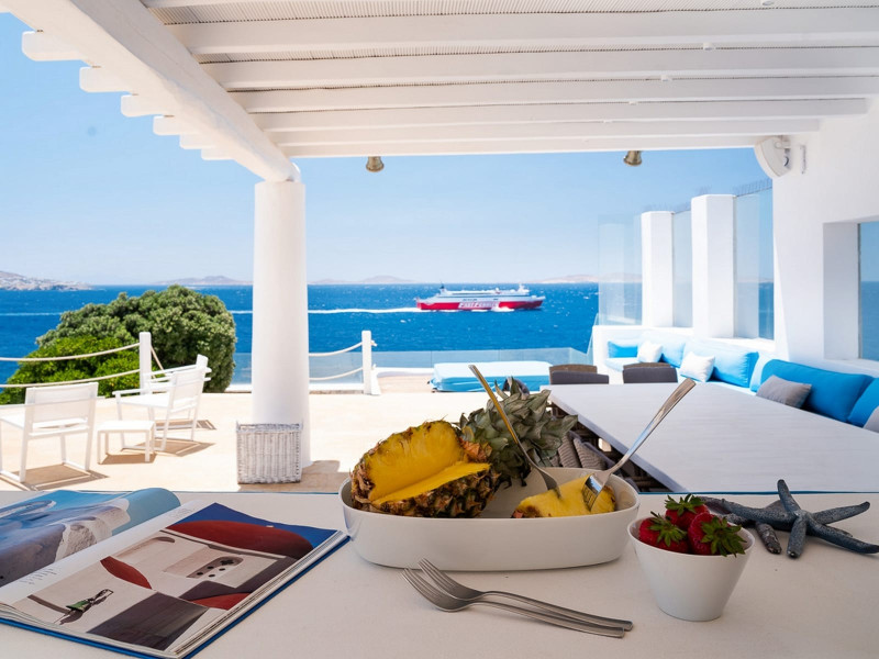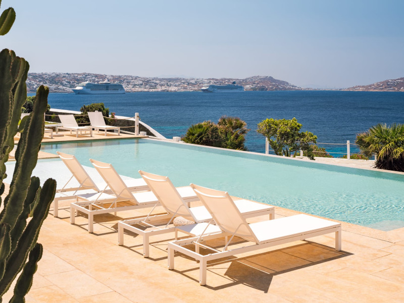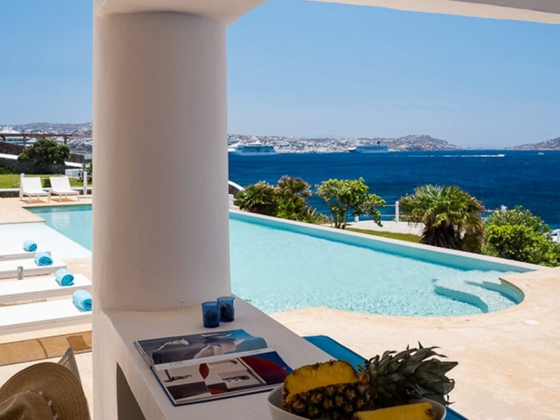 About the VillaNestled in the serene village of Agios Stefanos, just 3 km northwest of Mykonos town, Villa Skye is a captivating fusion of traditional Mykonian architecture and modern luxury. Originally built in the 1970s, this iconic seafront property has undergone a meticulous renovation to preserve its authentic charm while introducing top-tier amenities. Featuring 7 spacious bedrooms, a private swimming pool, a jacuzzi, a helipad, and an array of luxurious indoor and outdoor spaces, Villa Skye offers the ultimate retreat for guests seeking elegance and tranquility.The ProjectVilla Skye stands as a tribute to Mykonos' timeless allure. This renovated beachfront villa epitomizes island luxury with its thoughtfully curated spaces. From its chic interiors to its expansive outdoor areas, the property encapsulates the essence of Mykonian style, earning its reputation as “the most Mykonian of Mykonian villas.”The AreaMykonos needs no introduction, celebrated worldwide for its vibrant nightlife, stunning beaches, and picturesque villages. Agios Stefanos, a quaint village named after the beachside church perched at the bay’s edge, offers a peaceful contrast to the island’s bustling center. Located just a 15-minute drive from Mykonos town, Villa Skye is perfectly situated to provide both seclusion and convenience.
