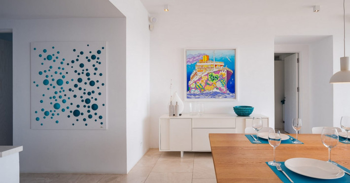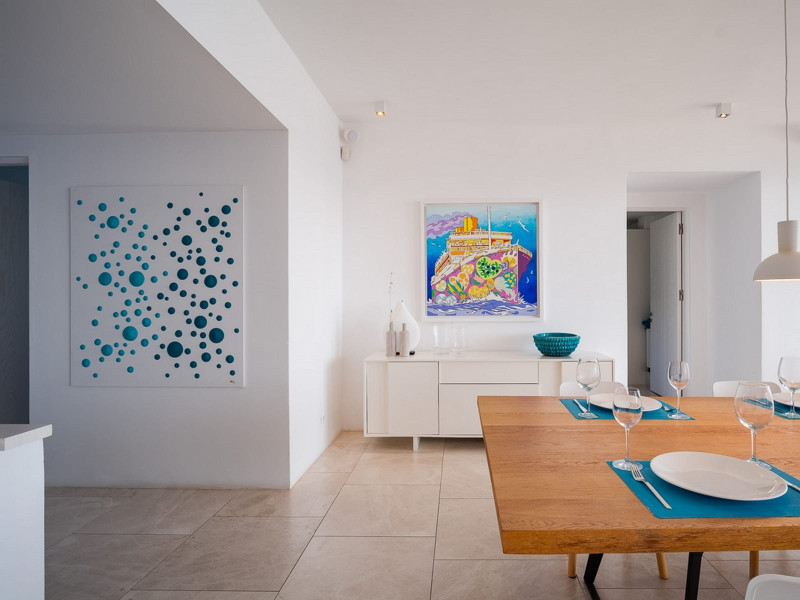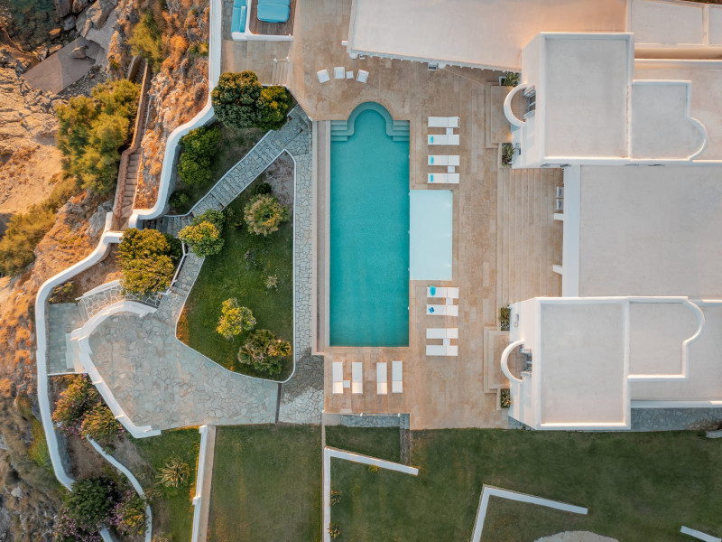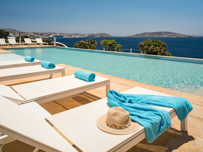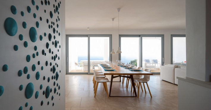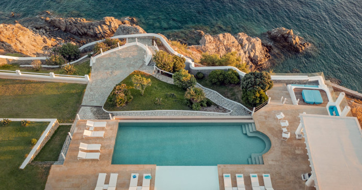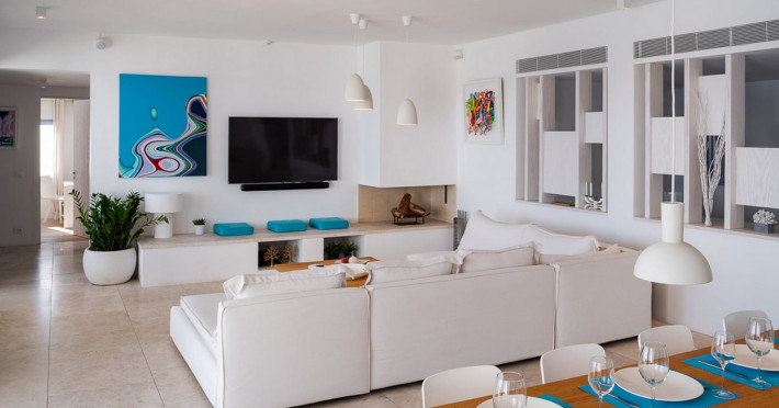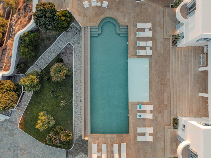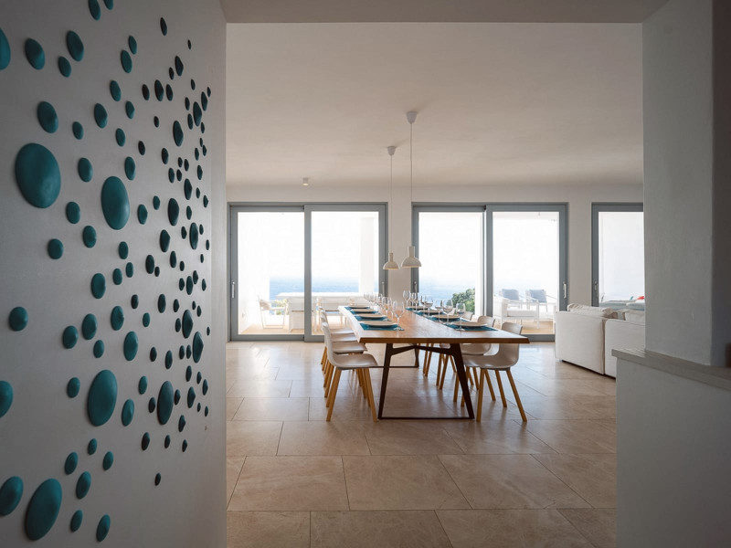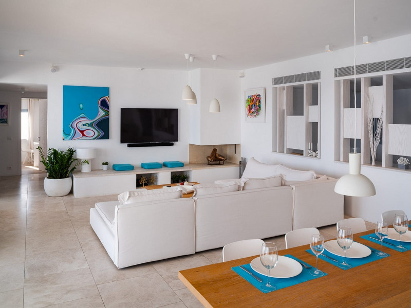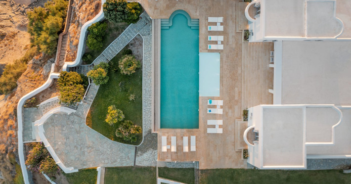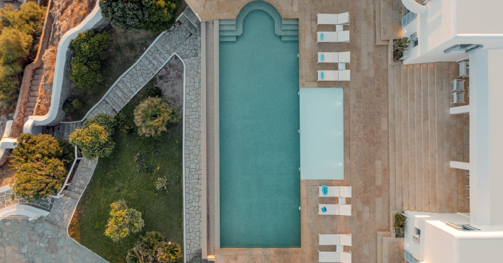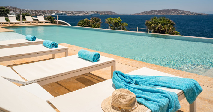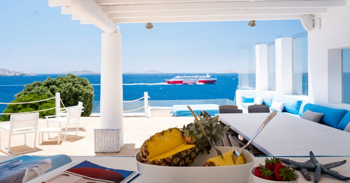 About the VillaNestled in the serene village of Agios Stefanos, just 3 km northwest of Mykonos town, Villa Skye is a captivating fusion of traditional Mykonian architecture and modern luxury. Originally built in the 1970s, this iconic seafront property has undergone a meticulous renovation to preserve its authentic charm while introducing top-tier amenities. Featuring 7 spacious bedrooms, a private swimming pool, a jacuzzi, a helipad, and an array of luxurious indoor and outdoor spaces, Villa Skye offers the ultimate retreat for guests seeking elegance and tranquility.The ProjectVilla Skye stands as a tribute to Mykonos' timeless allure. This renovated beachfront villa epitomizes island luxury with its thoughtfully curated spaces. From its chic interiors to its expansive outdoor areas, the property encapsulates the essence of Mykonian style, earning its reputation as “the most Mykonian of Mykonian villas.”The AreaMykonos needs no introduction, celebrated worldwide for its vibrant nightlife, stunning beaches, and picturesque villages. Agios Stefanos, a quaint village named after the beachside church perched at the bay’s edge, offers a peaceful contrast to the island’s bustling center. Located just a 15-minute drive from Mykonos town, Villa Skye is perfectly situated to provide both seclusion and convenience.