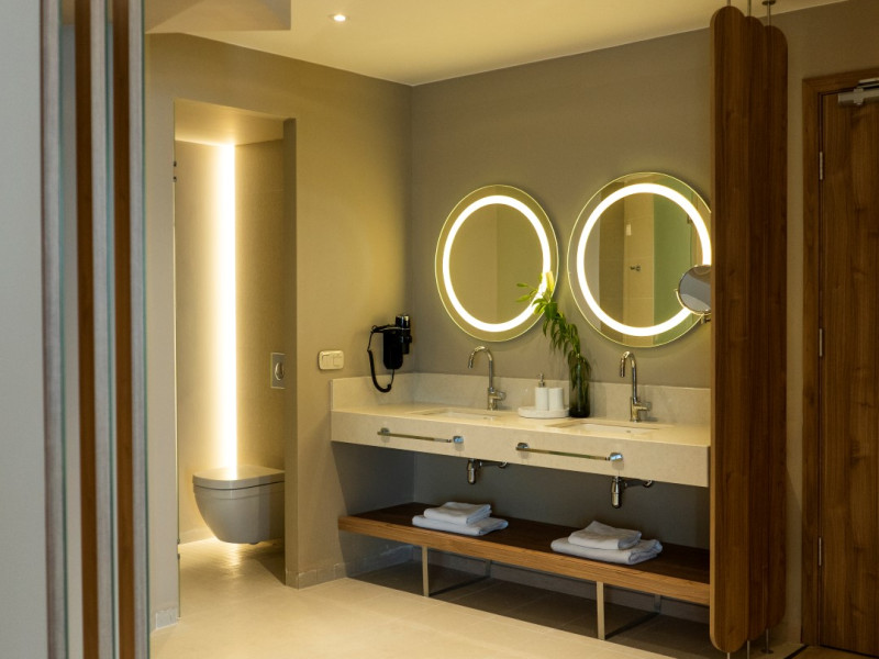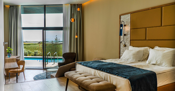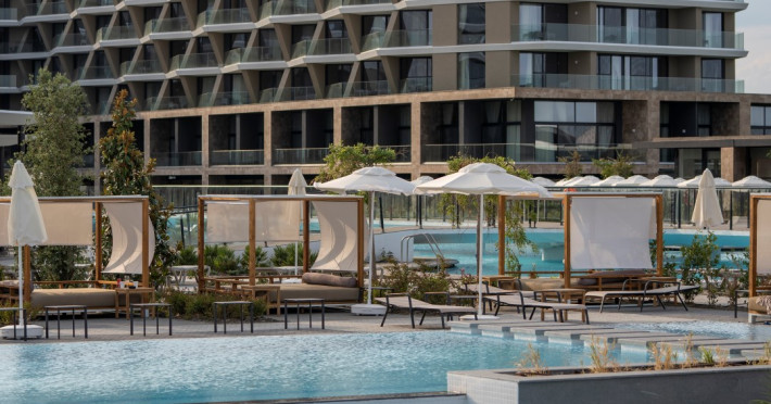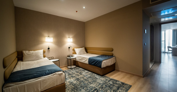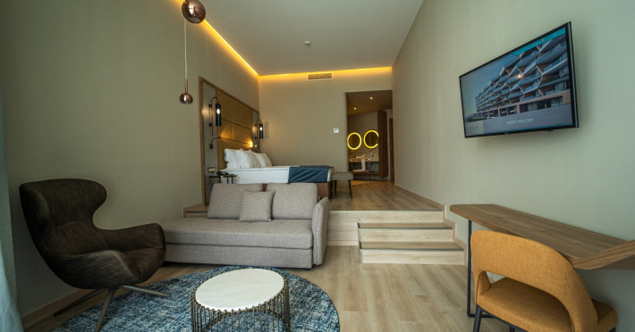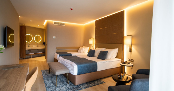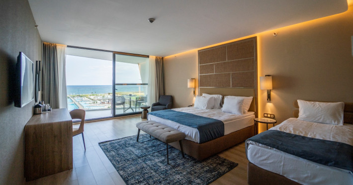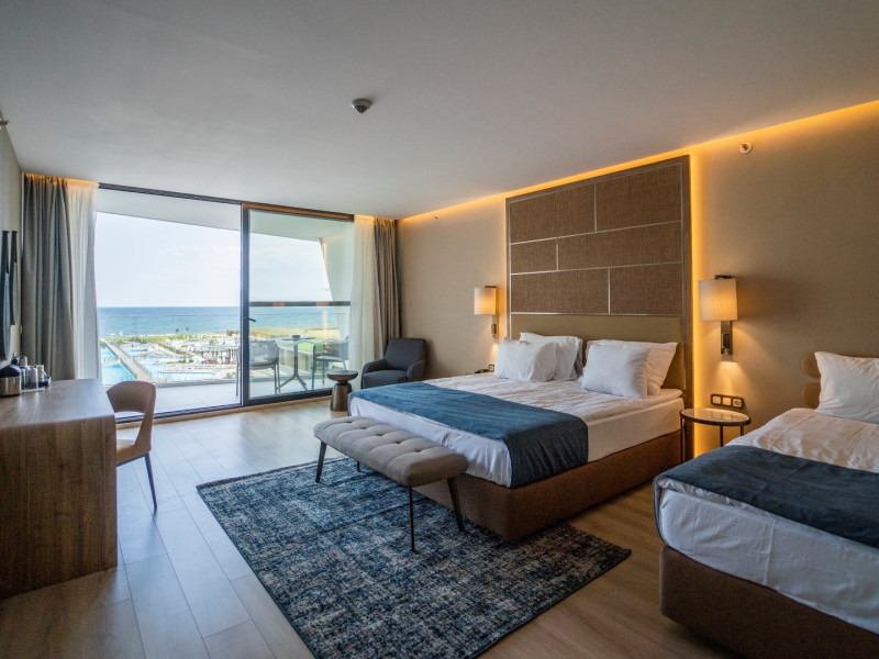 CAPACITATE: - cladiri cu 6 etaje - 6 lifturi - 280 de camere duble cu vedere laterala la mare (max. 2+1/3 persoane, 36 m²) - 31 camere duble cu vedere la mare (max. 2+1/3 persoane, 48 m²) - camere de familie (max. 2+2/3/3+1 persoane, 48 m²) - 20 de Suite Junior (max. 2+2/3 persoane, 43 m²) - 28 de camere Lagoon cu vedere la piscina (max. 2+2/3 persoane, 44 m²- 2 camere pentru persoane cu dizabilitati (max. 2+1 persoane, 36 m²).