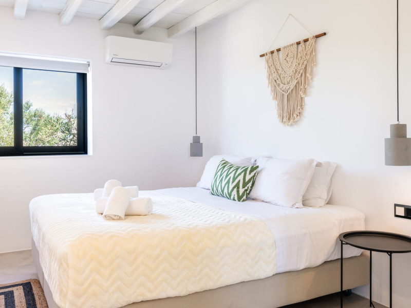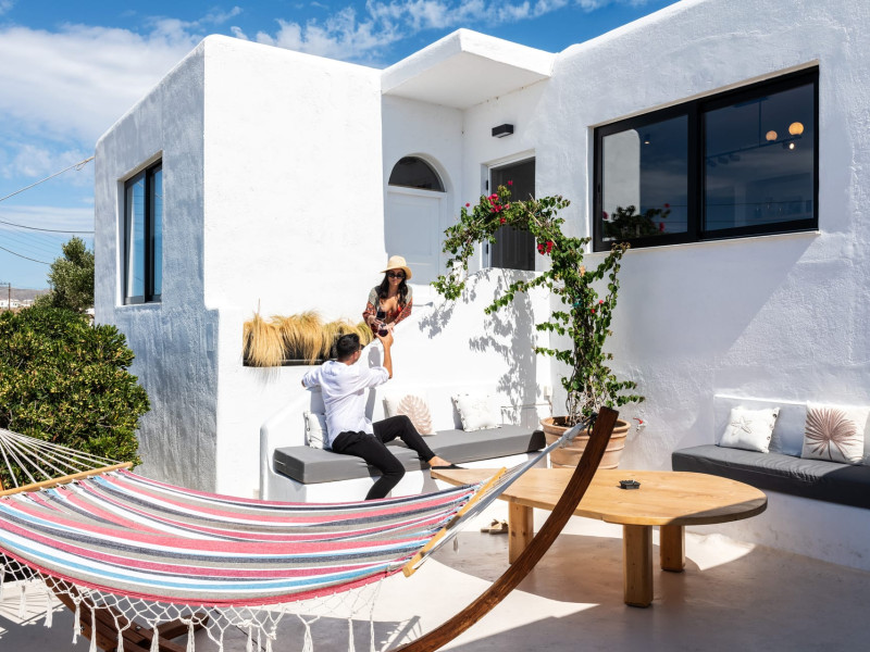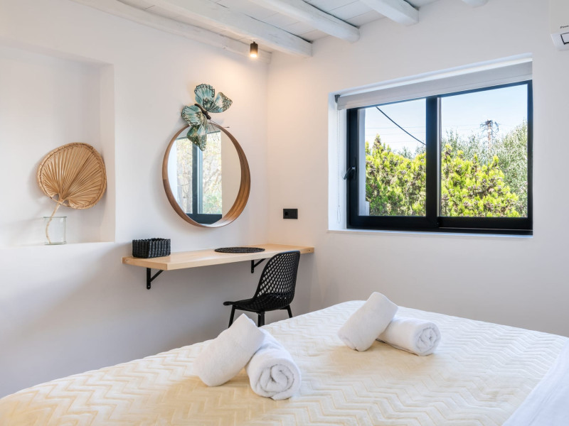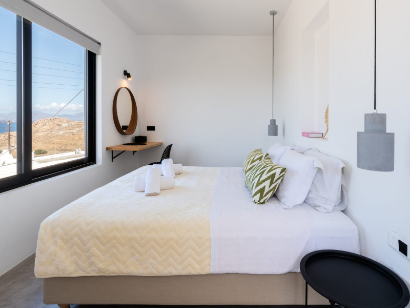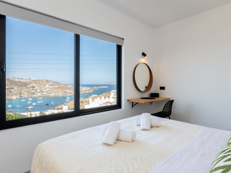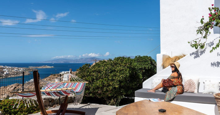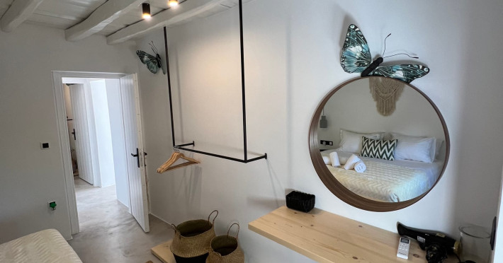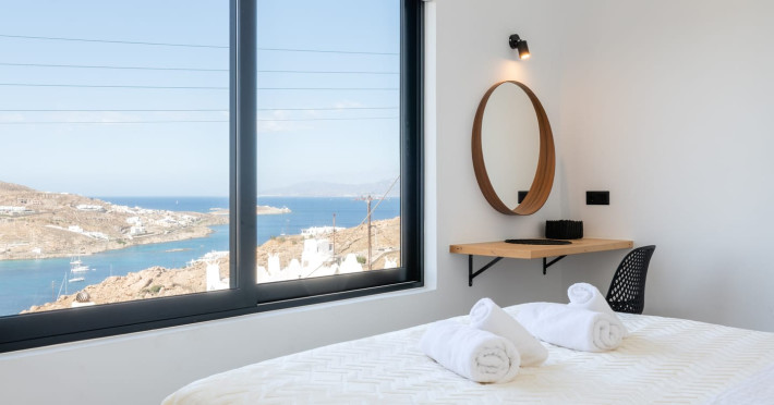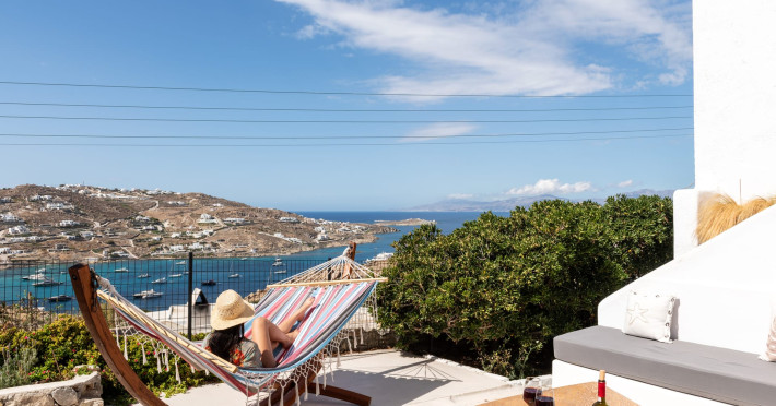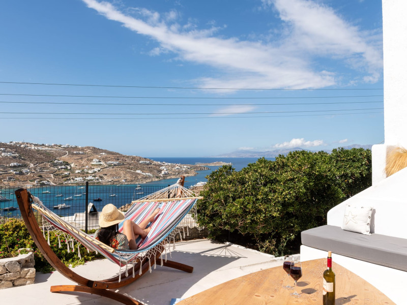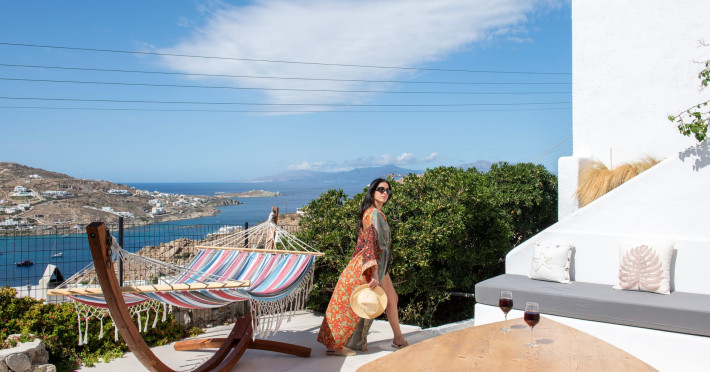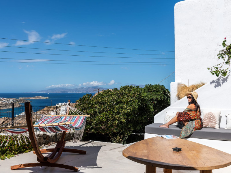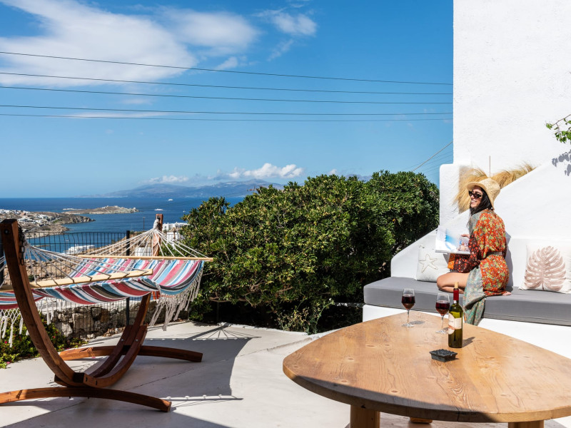 This 4 bedroom amazing house is situated moments from Ornos beach, the famous windsurfing/kitesurfing beach of Korfos and Mykonos town is only 3 minutes drive away or a 25-minute walk.There is view to the Aegean sea and Korfos beach. The house accommodates 8 guests and has also a big kitchen which is fully equipped with all the necessary appliances to prepare a meal, including a Nespresso coffee machine, a dishwasher, and a stove.One of the 4 bedrooms is situated outside the main house and has complete privacy along with beautiful sunset and sea views.