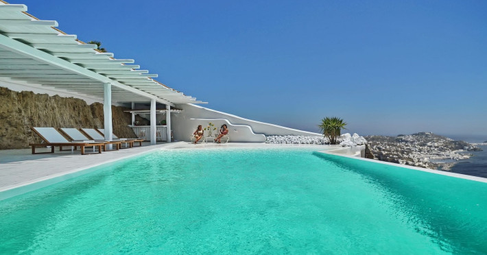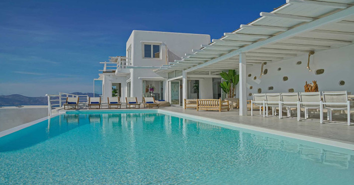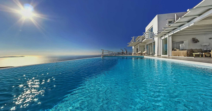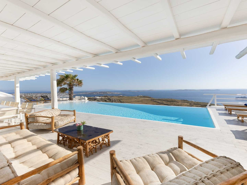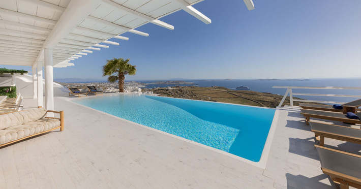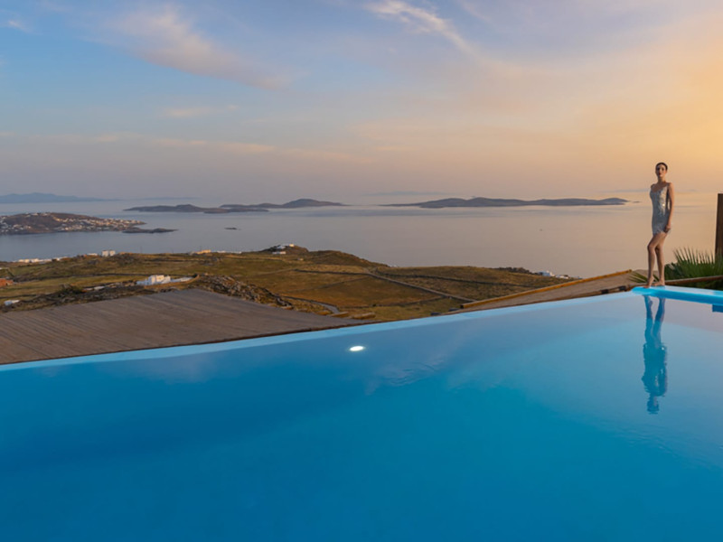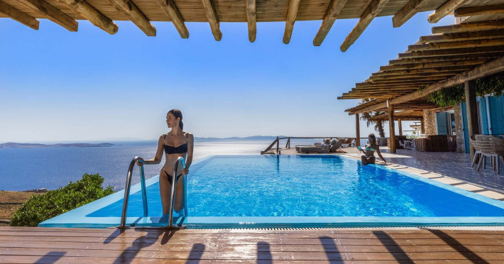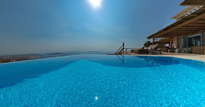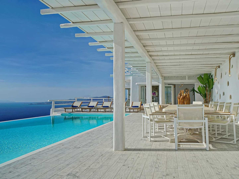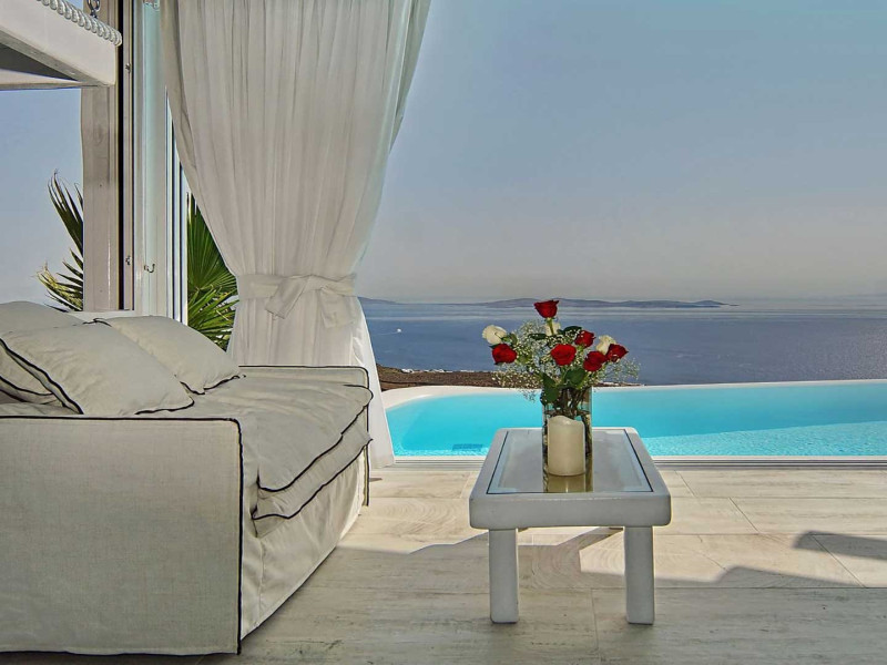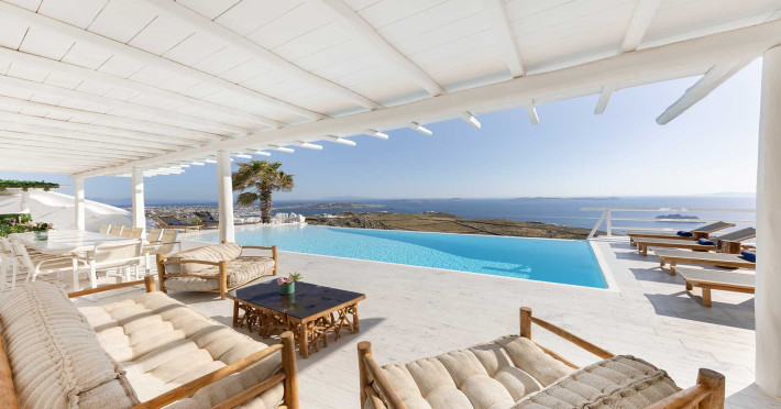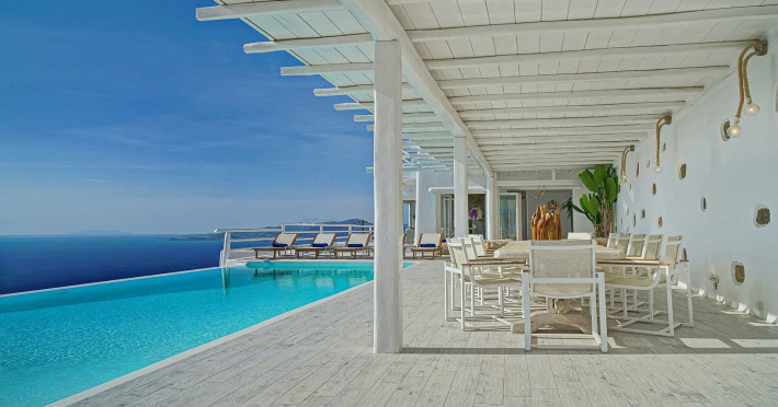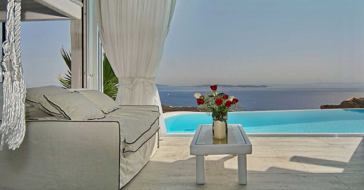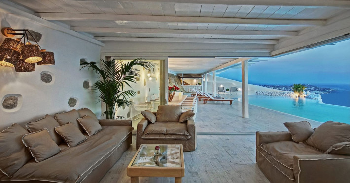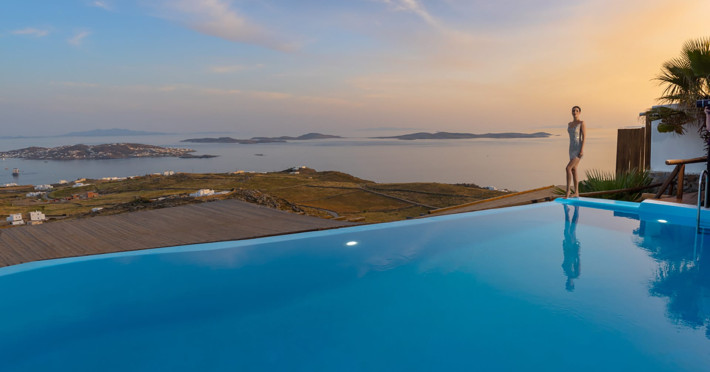 Panoramic Mykonos Luxury VillasEmbraced by the spectacular rocky coastal scenery of the picturesque area of Kastro in Mykonos Island in Greece, Zinas Mykonos luxury villas epitomize the ultimate luxury living experience while providing the highest degree of privacy and indulgence.Miraculously set amidst the emerald waters of the sea and the azure sky these utterly seductive Mykonos luxury Villas offer a heavenly retreat for couples seeking a one of a kind experience in some of the most exclusive private luxury villa rentals near Mykonos town.Idyllically situated on the top of the hill Zinas Villas in Mykonos seem to reach for the sky whilst enjoying commanding panoramic vistas of the endless horizon and the enchanting Mykonos town of the magnificent insular complex of the Cyclades in Greece.All luxury villa rentals with pool have been crafted and decorated to high standards of luxury and style with unique natural handmade furniture and impressive irreplaceable adornments meticulously collected from all heavens on earth by the owner himself, the well-known Greek fashion designer Panos Zinas, who also owns a glorious fashion boutique in Mykonos town supplying luxurious gowns, day dresses and beachwear.Unrivaled Luxury Villas in Mykonos for CouplesNuzzled amidst the gracious nature the unrivaled Zinas luxury villas in Mykonos harmoniously blend into the miraculous seascape providing an intimate hideaway for couples and discerning travelers in search for a heaven on earth. Brilliantly positioned in the scenic area of Kastro near Mykonos town these exclusive private villa rentals with pool have been brilliantly appointed and designed to ensure a prestigious holiday experience for all treasured guests.Zinas luxury accommodation in Mykonos offers the perfect setting for indulging holidays, exclusive honeymoons and romantic interludes in the captivating island of Mykonos of the Cyclades islands cluster in Greece.Couples can succumb to the serenity that beckons from the tranquility of the shimmering sea, immerse in the Jacuzzi as the sunset slowly fades over the horizon and relish a candle light dinner under the veil of stars as the sweet sea breeze gently caresses their face.